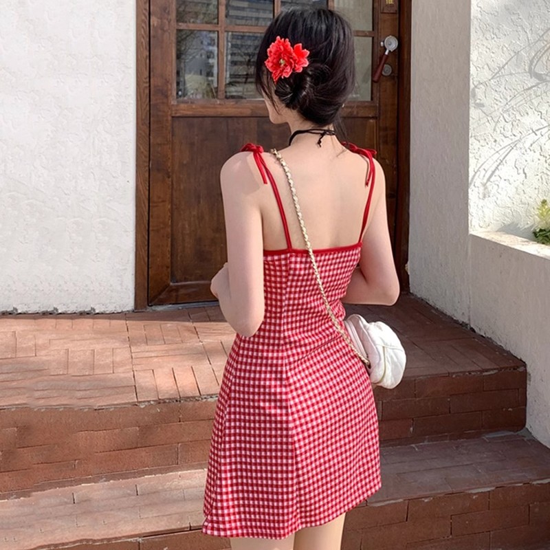 Newlan QZ186 Mini Dress Wanita Gaya Korea Casual Dress Gaun Bodycon Botton Sexy / Houndstooth Korea Halter Neck Dress Tali Satu, Jumpsuit, Over All, Outer Vintage Summer Dress Rok Tali Ikat Gaun Pendek Gaun Pantai Kasual