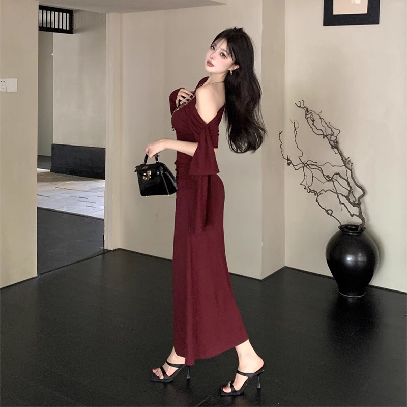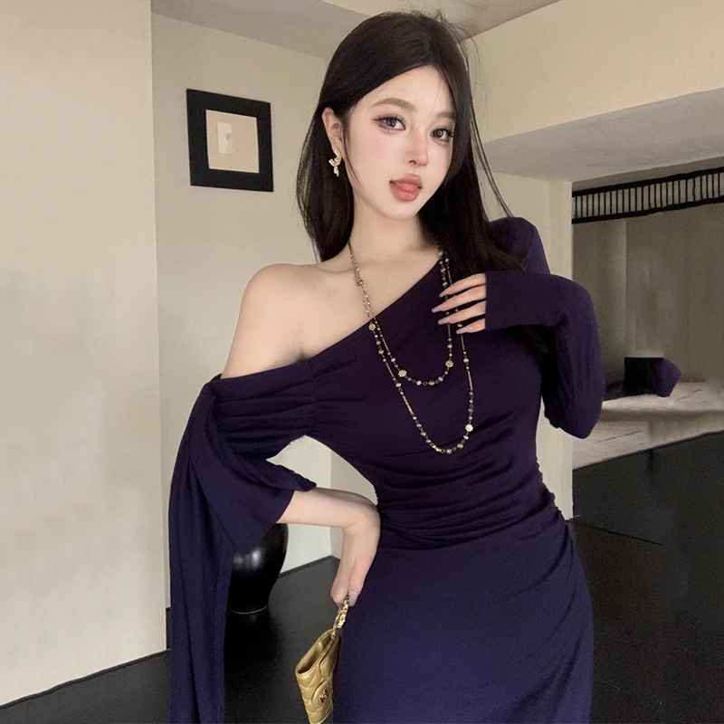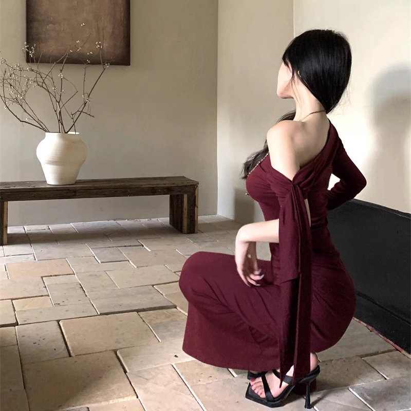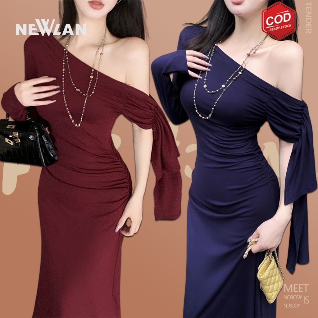 Newlan QZ249 Casual Long Dress Wanita Dress Panjang Off Shoulder Rib Knit Terusan Tangan Panjang Sabrina Dress Korean Basic Maxi Dress Summer One Shoulder Sexy Dress Tali Dress Ikat Samping Party Seksi Dress Rok Pinggul Ramping Tidak Teratur Temperamen