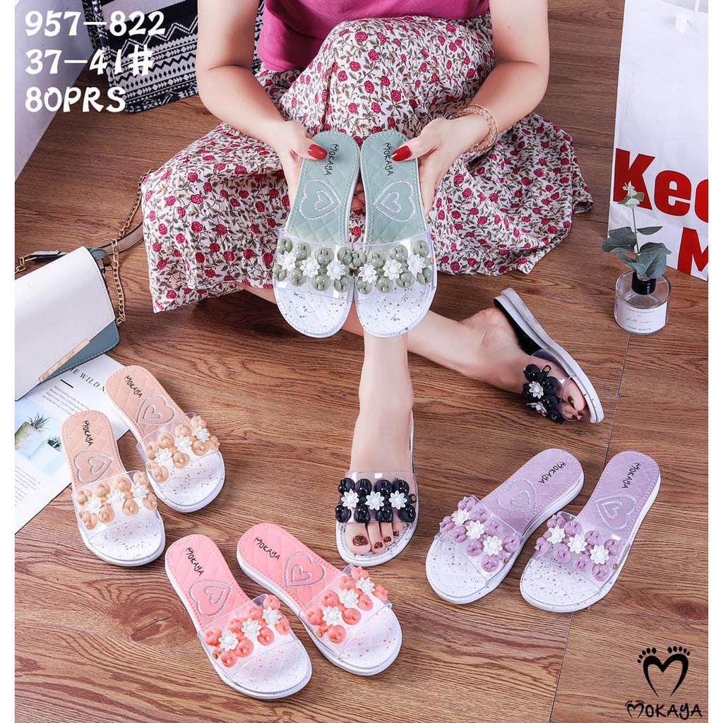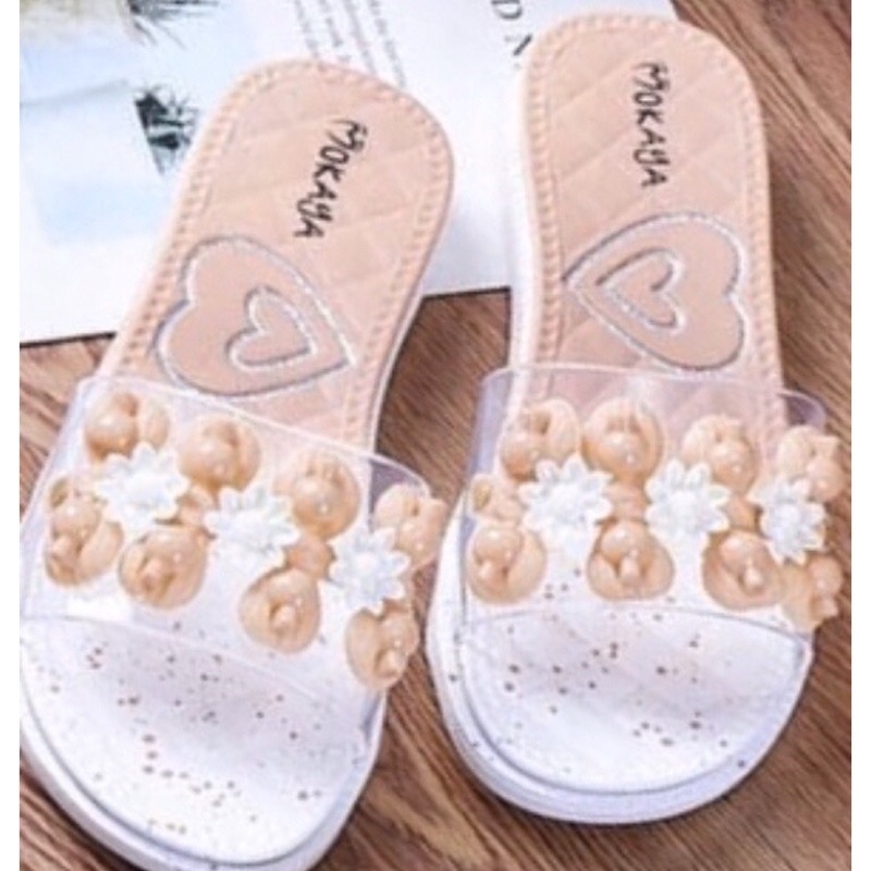 Sandal slop wanita ban pita bunga putih warna sembur Super cantik manis Import Mokaya/Size 37-41 (957-822)