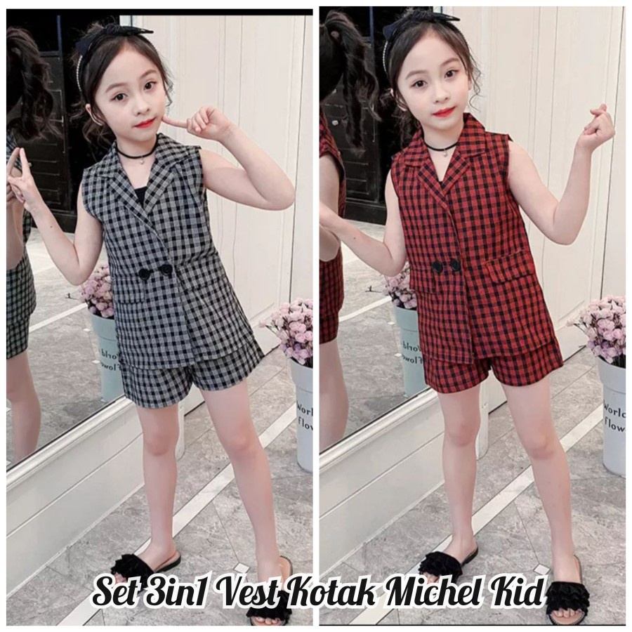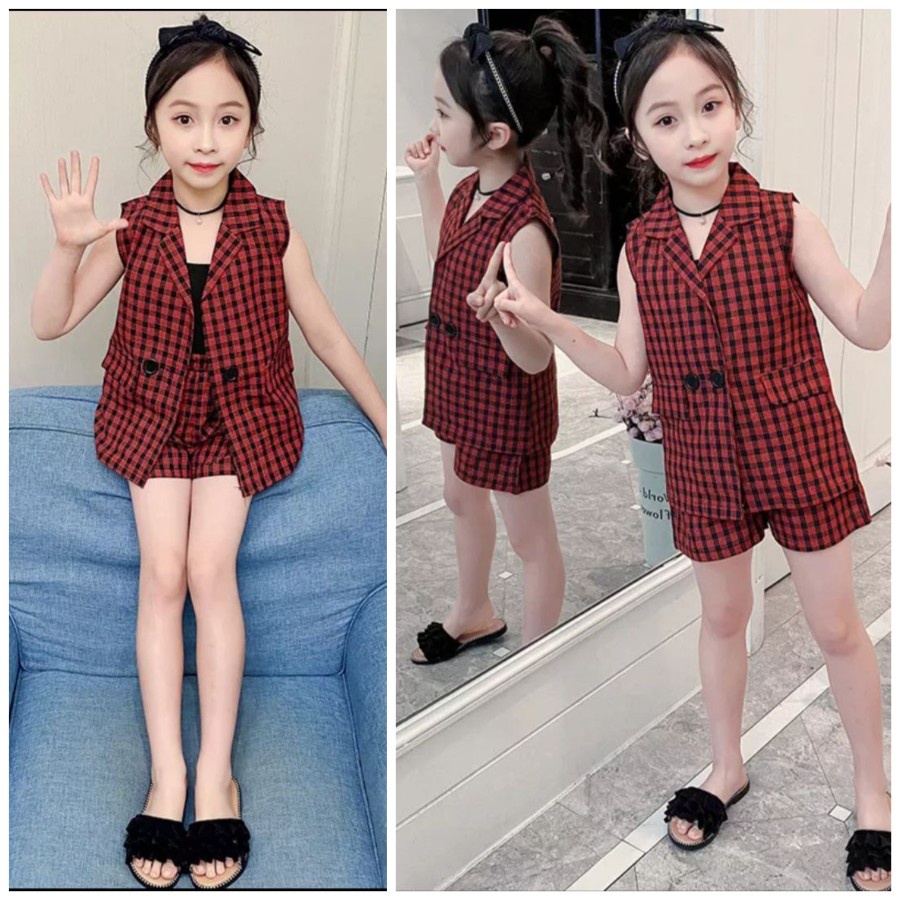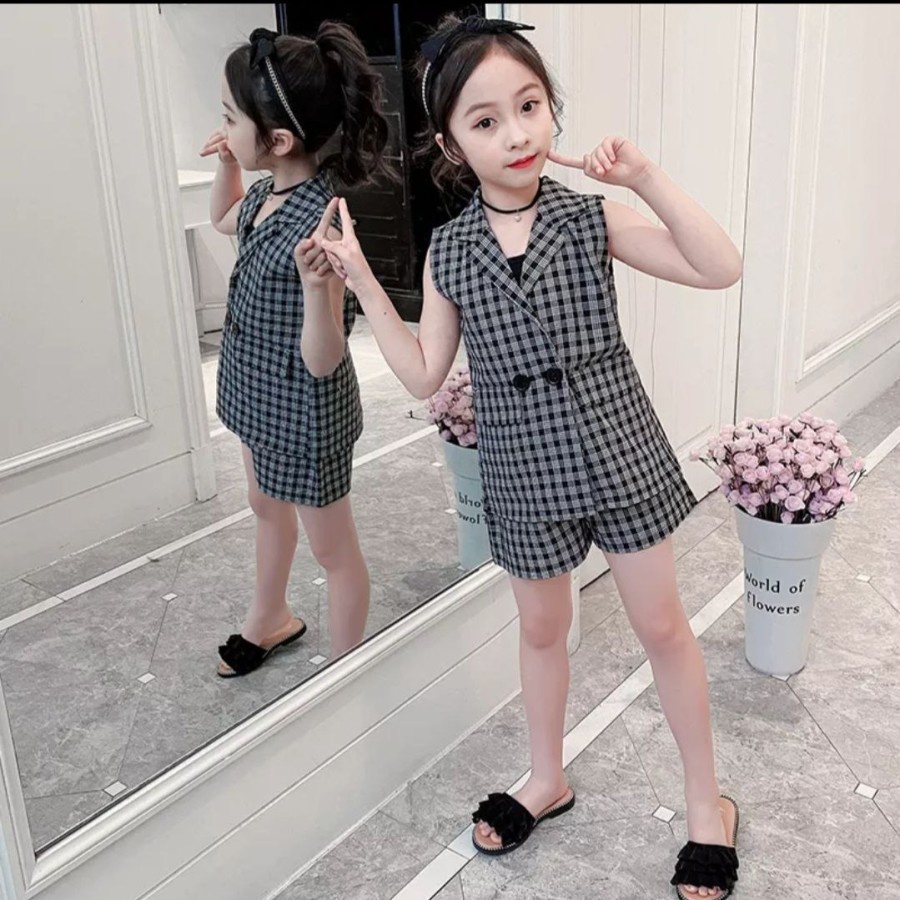 Baju Setelan Celana Pendek Anak Perempuan Usia 5-8 Tahun Kekinian Ala Korea Style Satu Set Vest Dan Celana Anak Cewek Kotak Kotak Milka