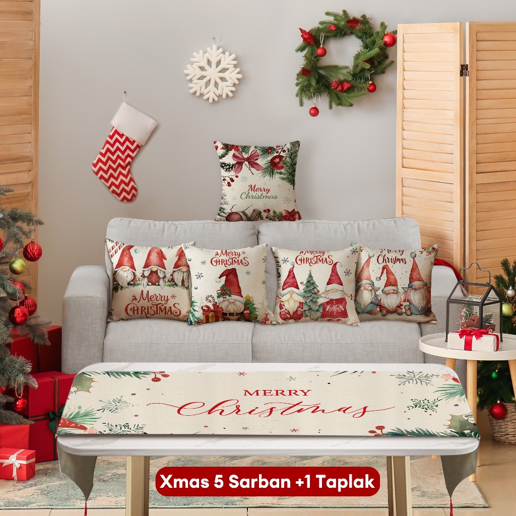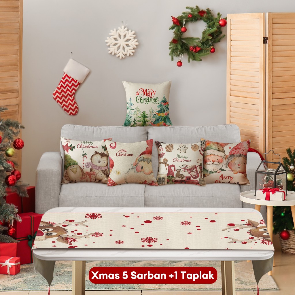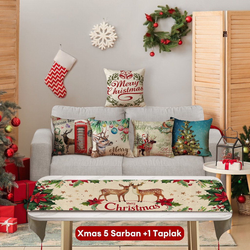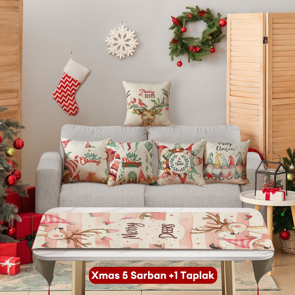 Natal Cetak Linen 40*40cm Sarung Bantal+ Taplak Meja Setelan Dekorasi Xmas Rumah 6 Buah Set Alas Meja Hadiah Natal