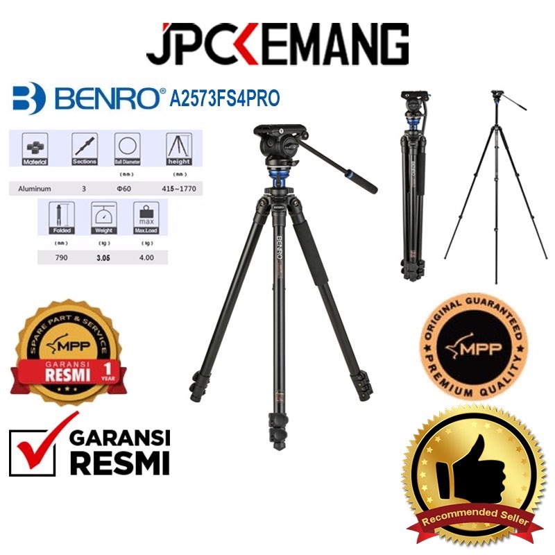 Benro S Pro Aluminium Video Tripod Single Tube Flip Lock S4PRO Fluid Pan Head A2573F Garansi Resmi