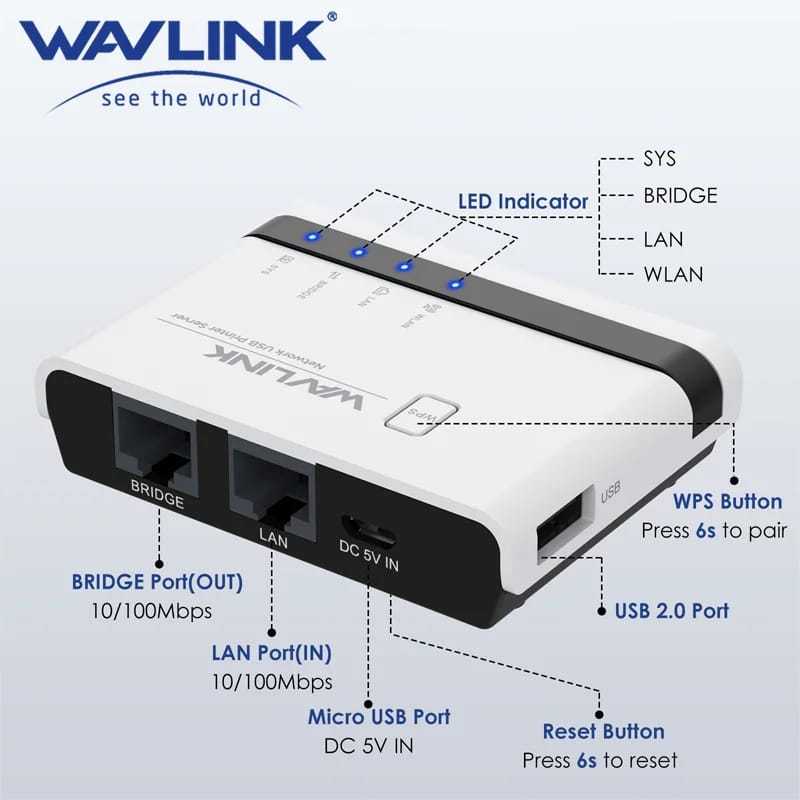 WAVLINK Wireless Print Server, USB WiFi Print Server with 100Mbps LAN & Bridge, Wired/Wireless/Standalone Modes, USB2.0, Compatible with Windows, Mac and All RAW-Supported Printers