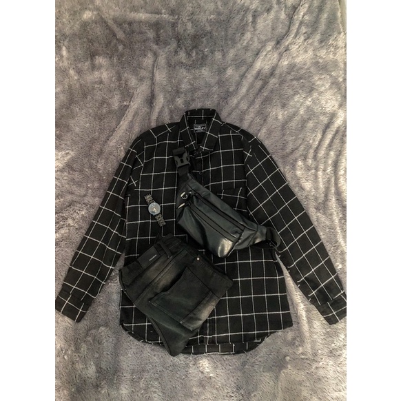 Kemeja Flanel Kotak Hitam Garis Putih Casual Pria/Wanita