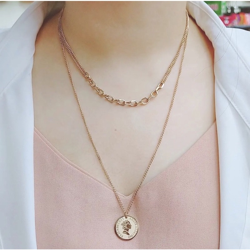 Kalung titanium rantai 2 layer koin vintage elizabeth