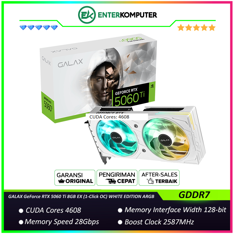 GALAX GeForce RTX 5060 Ti 8GB GDDR7 EX (1-Click OC) WHITE EDITION - ARGB LIGHTING OVERHAUL - DUAL FAN