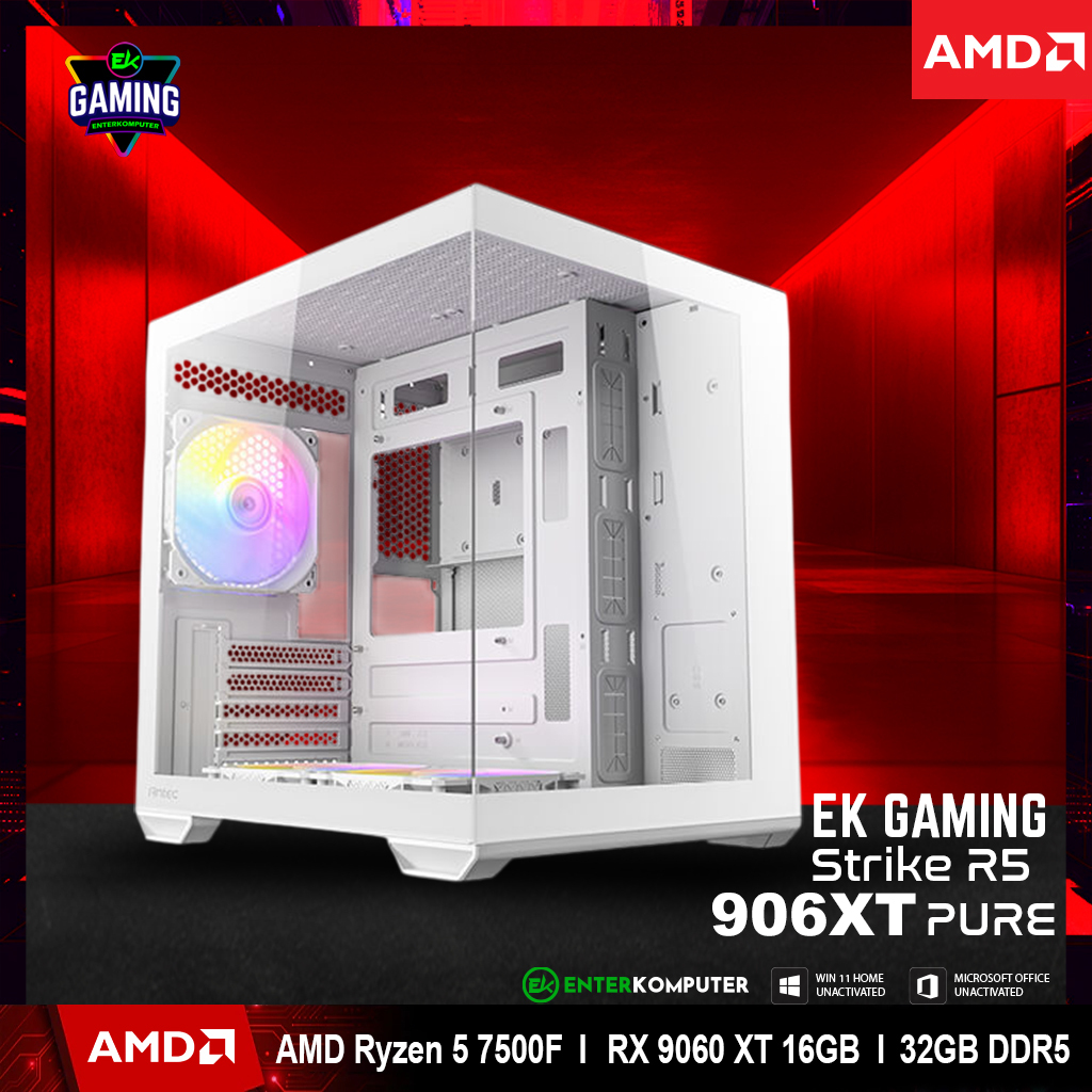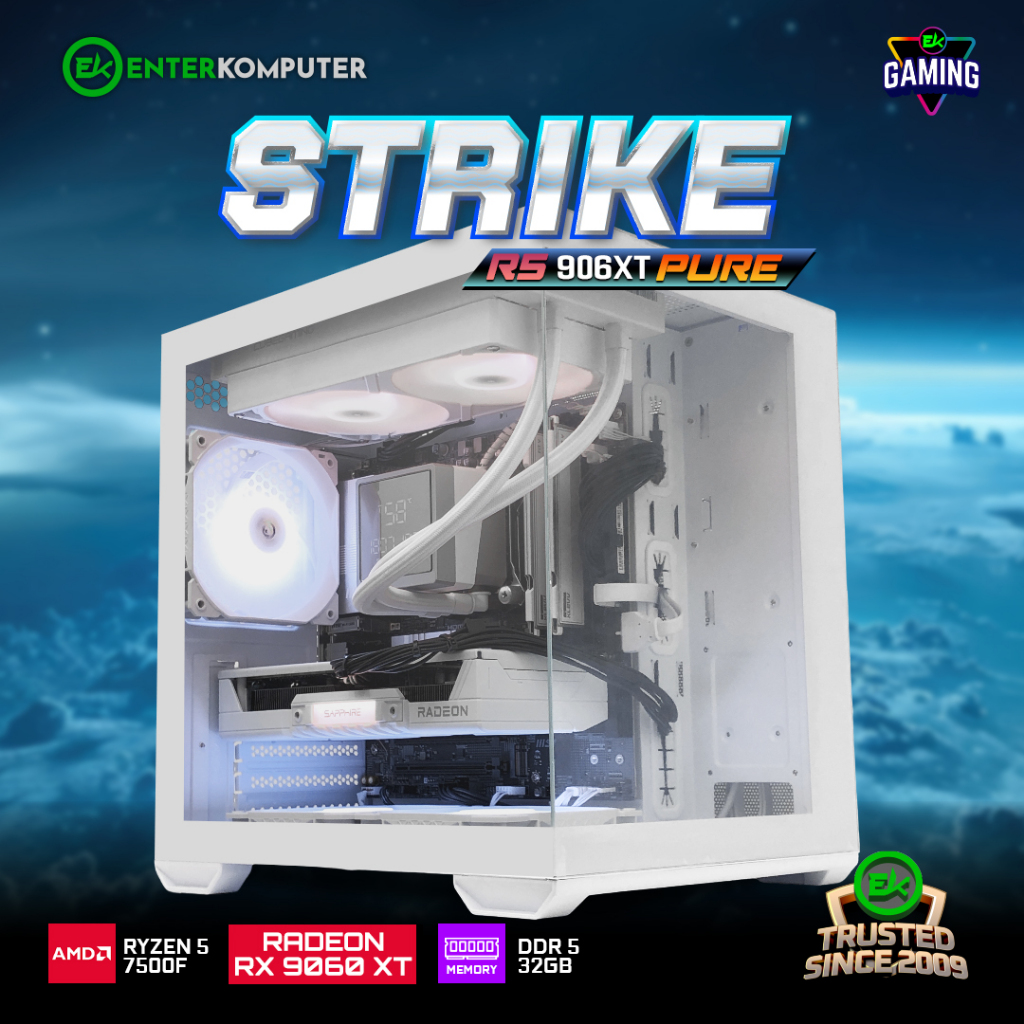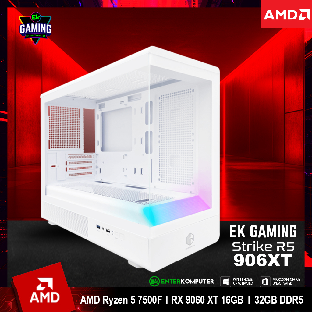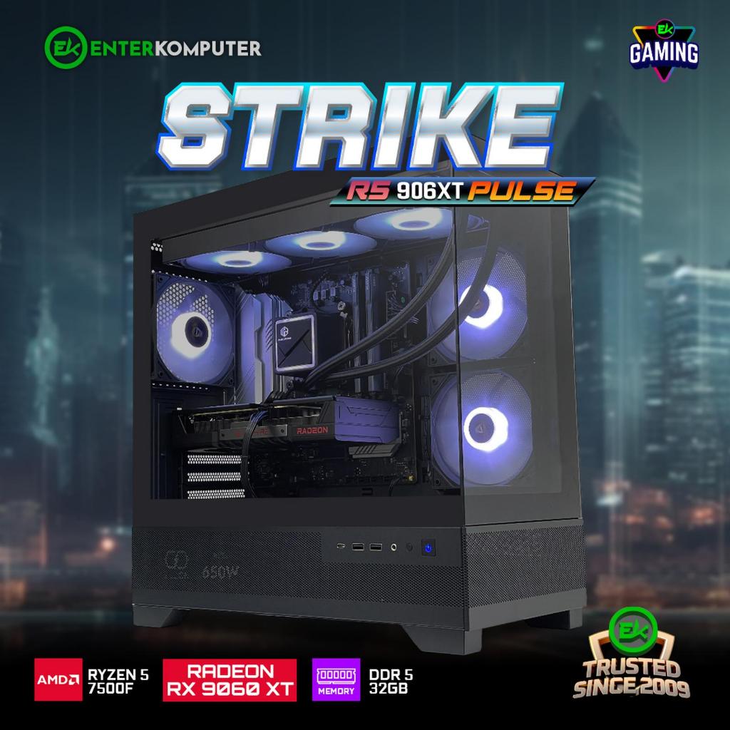 EK Gaming Strike R5 906XT - PC Rakitan Gaming Ryzen 5 7500F RX 9060 XT 16GB RAM 32GB DDR5 - Enter Komputer