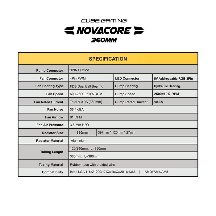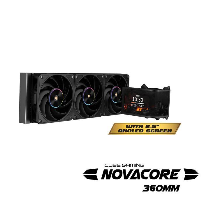 CUBE GAMING NOVACORE 360 ARGB BLACK PERFORMANCE FAN Liquid Cooler - L-Shaped 6.5" AMOLED Screen - Magnetic Rotatable Pump Head with Custom Display
