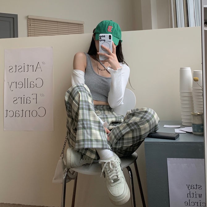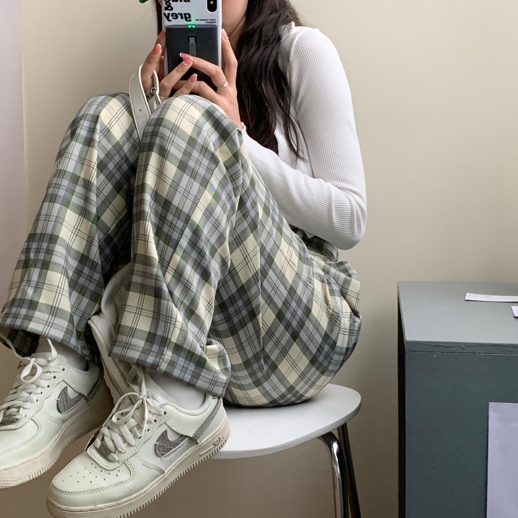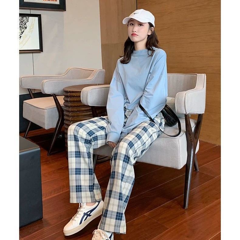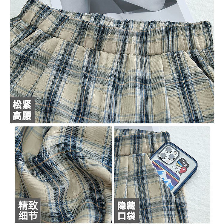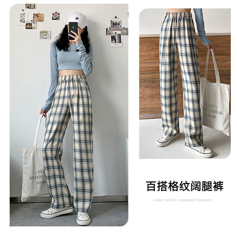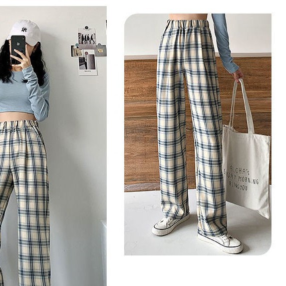 Celana wanita kotak-kotak hitam putih biru aprikot musim semi dan panas versi Korea