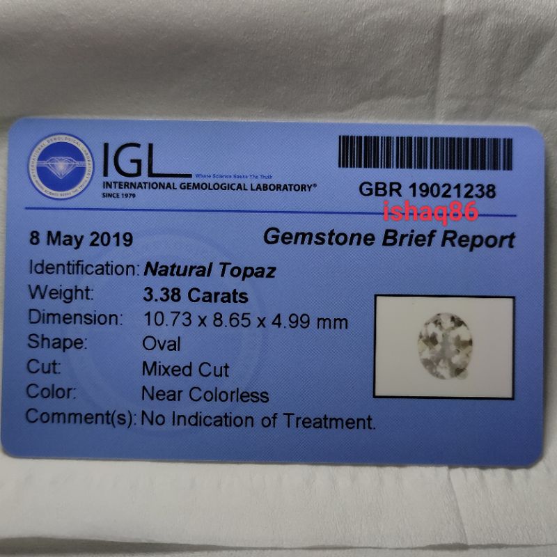 NATURAL COLORLESS WHITE TOPAZ PUTIH MEMO IGL LAB 1238