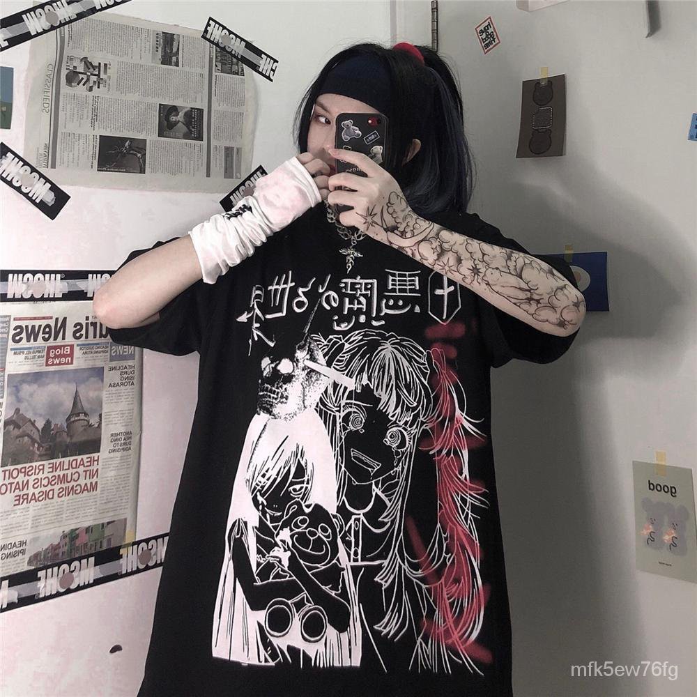 【Pengiriman Bebas】Summer Goth Female Tee Aesthetic Loose Women T-shirt Punk Dark Grunge Streetwear Ladies gothic Top T