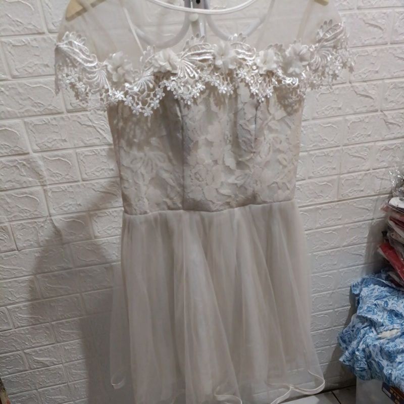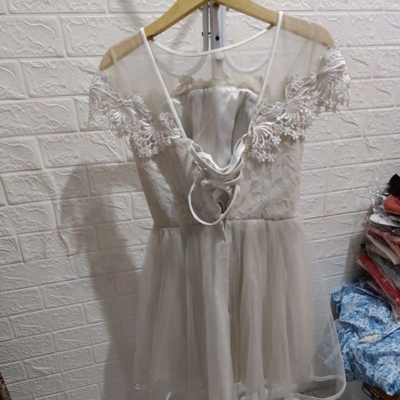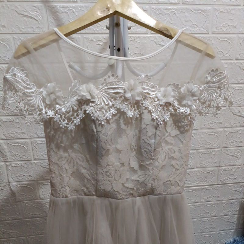Dress putih tulang cantik tali belakang adjustable atas brokat