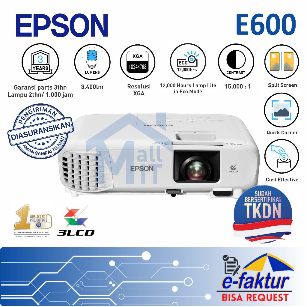 MALLIT EPSON Proyektor EPSON EB-E600 EBE600 EB E600 XGA 3LCD 3400 Lumens TKDN Split Screen VGA HDMI Garansi Resmi Medan