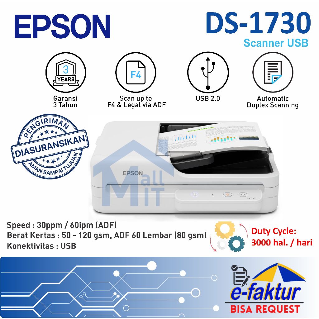 MALLIT EPSON Scanner Epson DS1630 DS-1630 DS1630 DS-1730 DS 1730 DS1730 Duplex ADF Flatbed A4 USB Garansi Resmi Medan