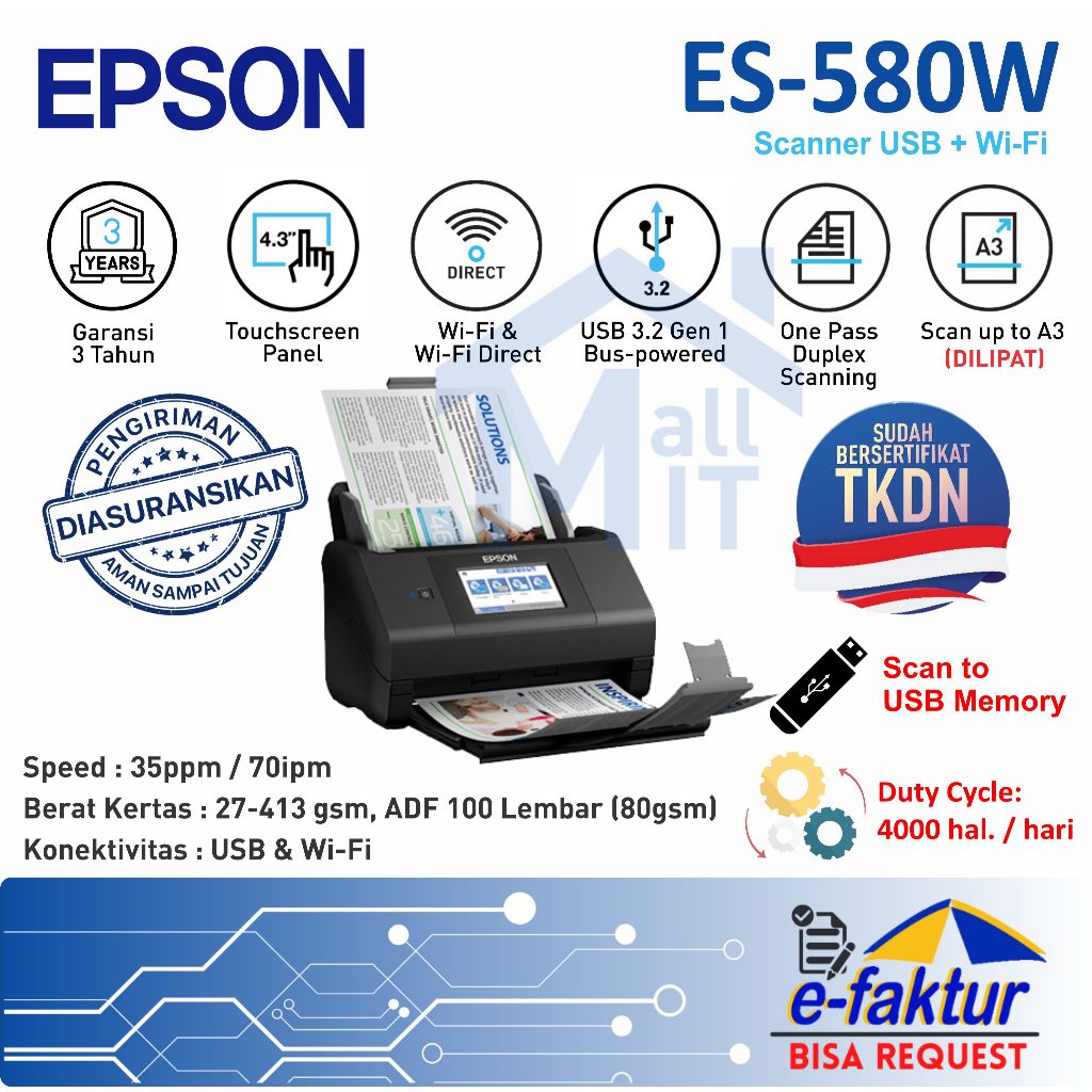 MALLIT EPSON Scanner Epson ES-580W ES580W ES 580W ES 580 W A4 F4 Legal Wireless WiFI Duplex ADF Garansi Resmi Medan