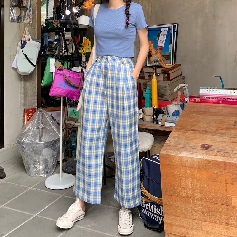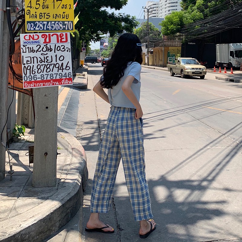 Celana Panjang Model Lurus Lebar Longgar Motif Kotak-Kotak Ada untuk Wanita