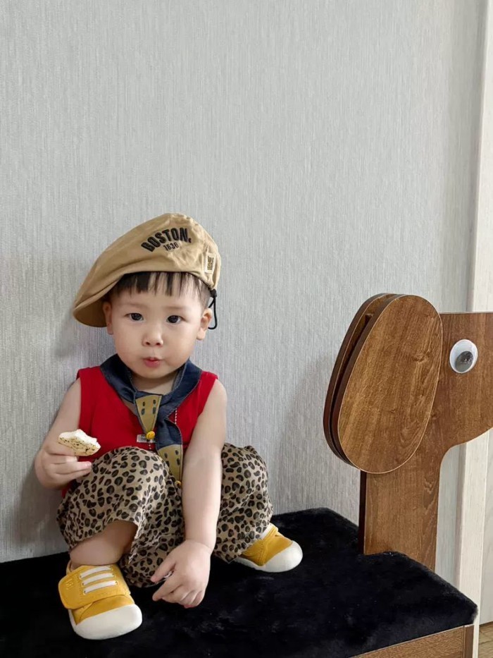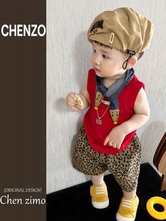 Setelan Anak-anak Musim Panas Baru Pria dan Wanita Tanpa Lengan Rompi Bottoming Merah Gaya Barat Celana Pendek Motif Macan Tutul Set Dua Potong