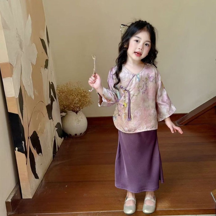 Setelan Hanfu Anak Perempuan Kualitas Tinggi Gaya Cina Anak-anak Dua Potong Set Musim Gugur Gaya Cina Baru Cheongsam Merah Muda Atasan Lengan Panjang Pakaian Kotak-kotak Baoge Wanita