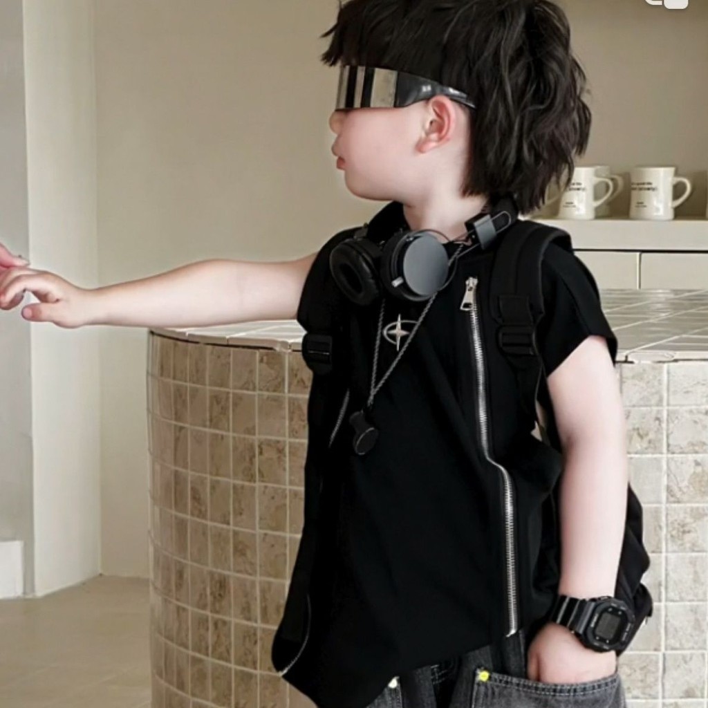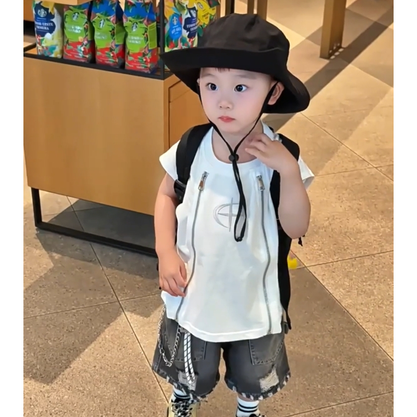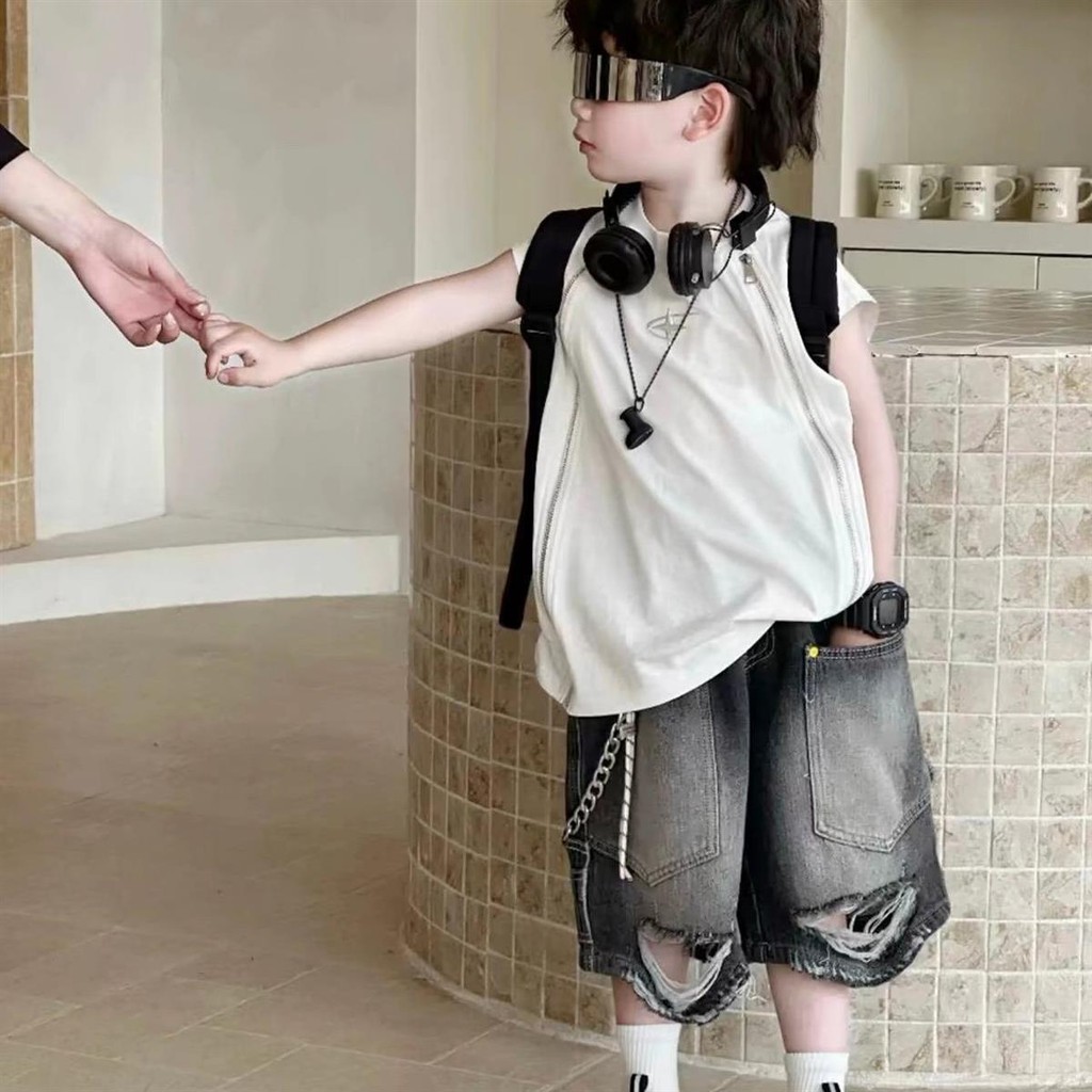 ready 2026 Setelan Denim Sobek Retro Anak Laki-Laki korean style musim panas baru vagina murni lengan rompi retro retro ripped jeans gaya panas