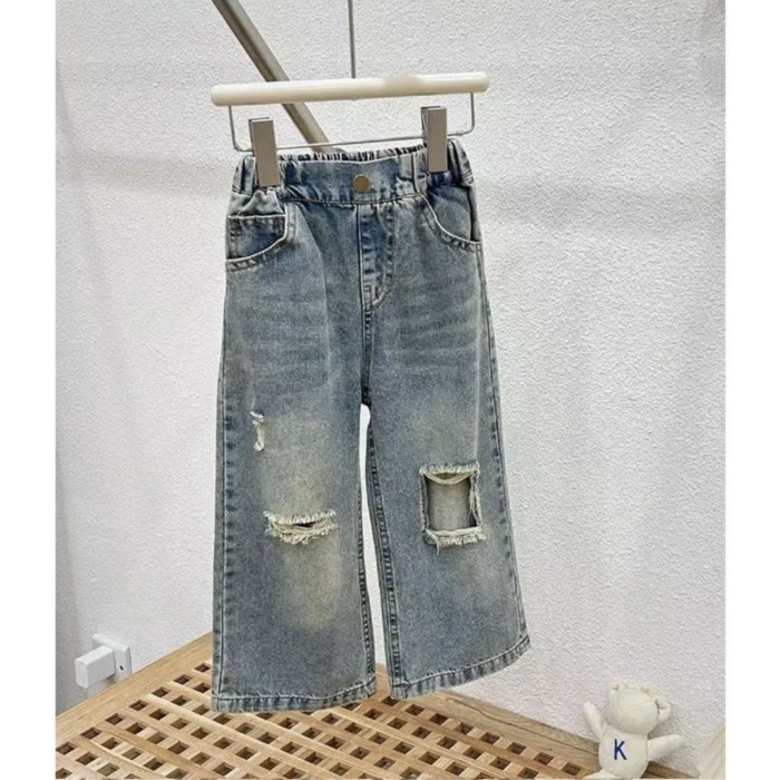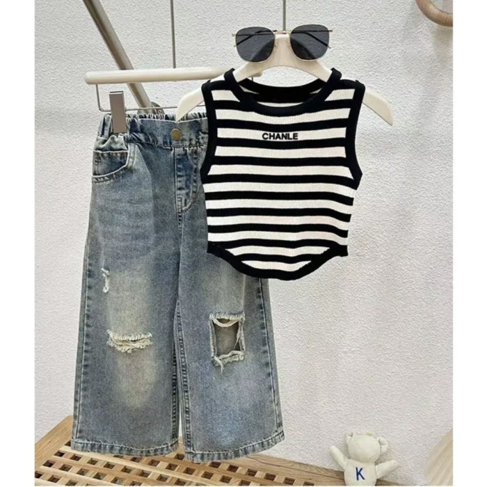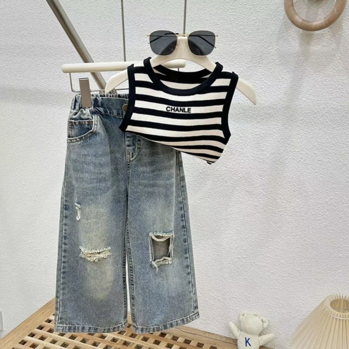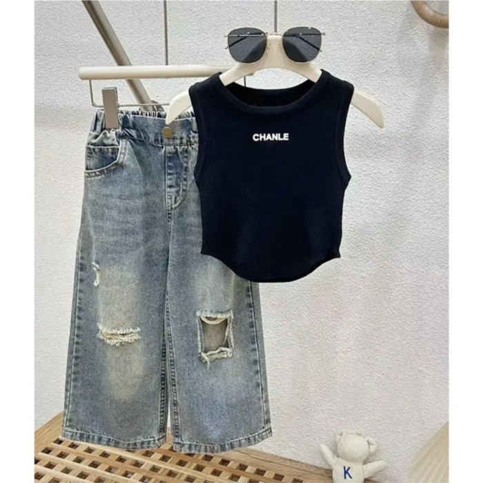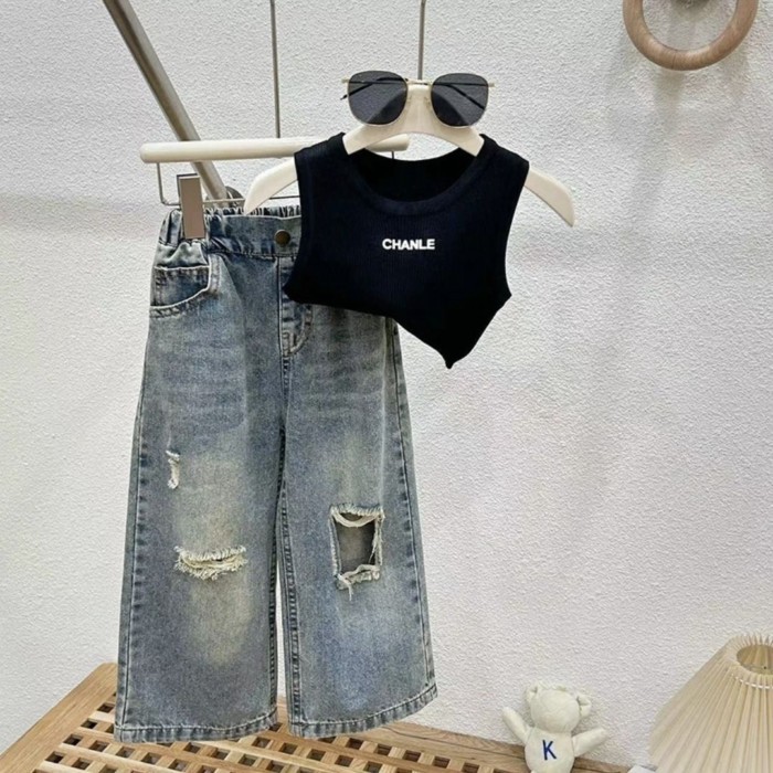 Setelan Musim Panas Baru Anak Perempuan Pakaian Musim Panas 2026 untuk Anak Perempuan, Suspender Modis, Celana Jeans Robek Modis Anak Perempuan Set Dua Potong
