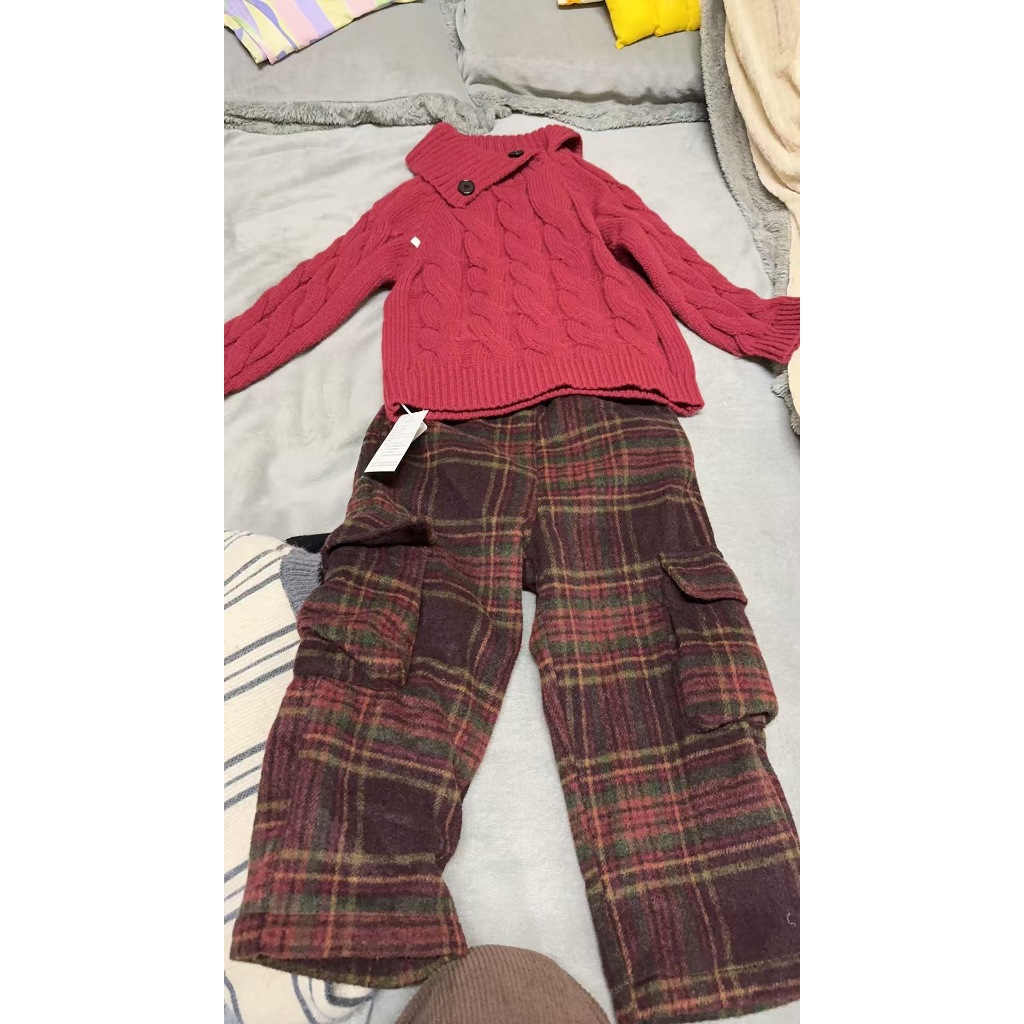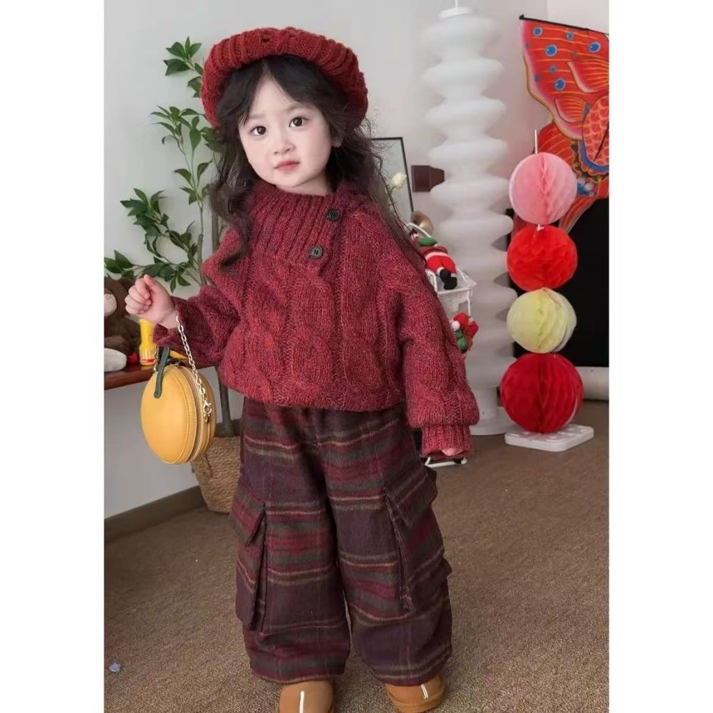 Setelan Anak Laki-laki Korea Tebal Pakaian Anak-anak 2026 Musim Gugur dan Musim Dingin Tahun Baru Tahun Baru Sweter Leher Kotak Merah Anak Laki-laki dan Perempuan Overall Kotak-kotak Wol