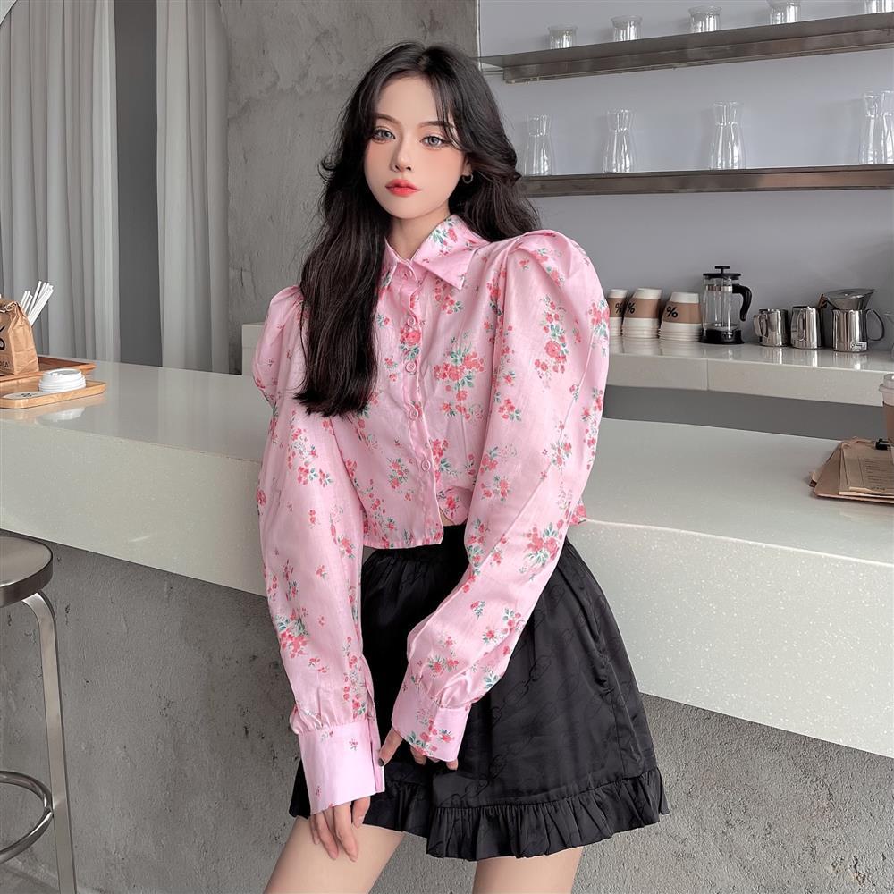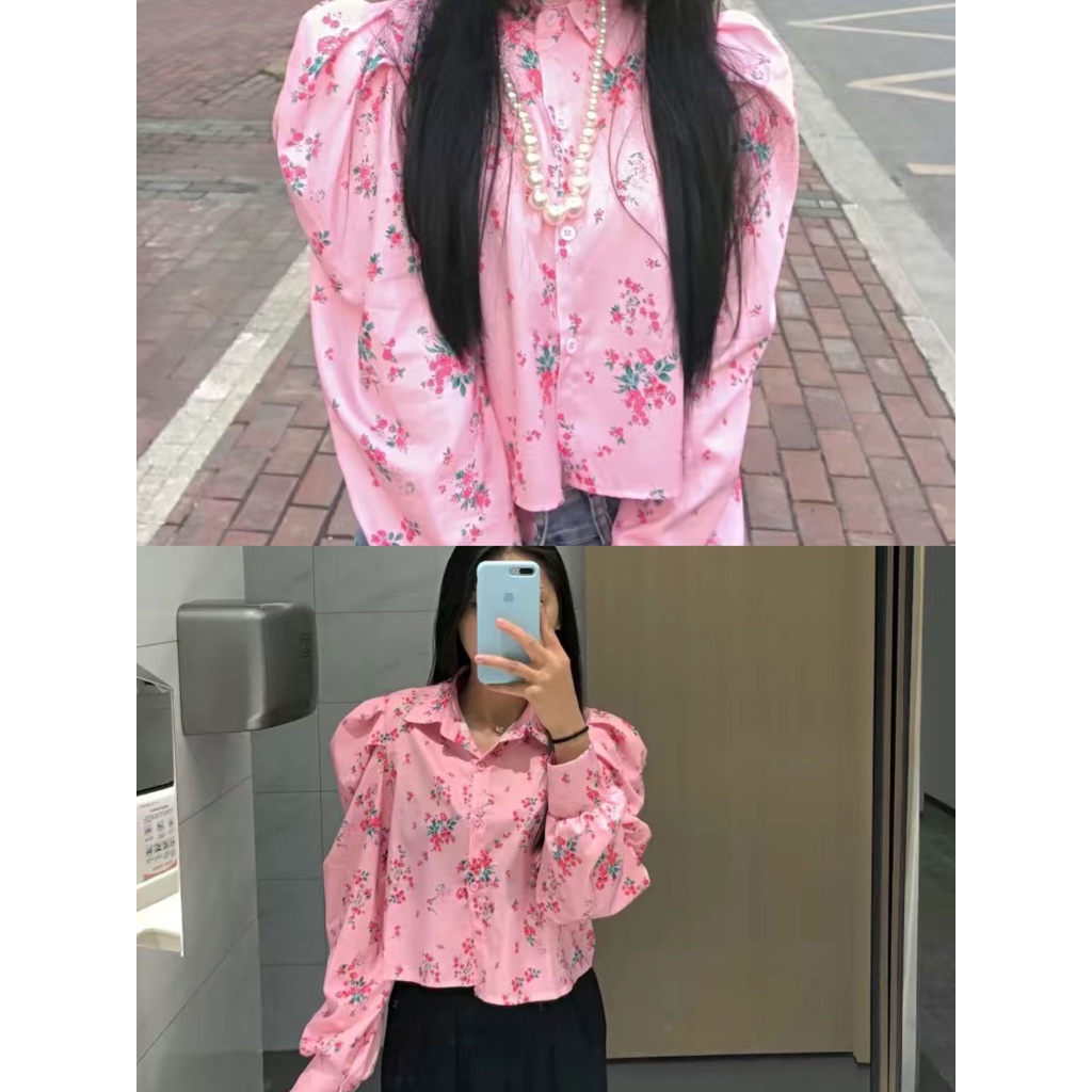 Prove Sweet Cool Girl Small Flower Age Reduction Pink Shirt Musim Semi dan Musim Gugur Gaya Baru Bubble Lengan Panjang T-Shirt Lengan Pendek