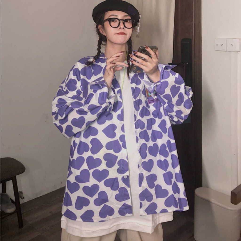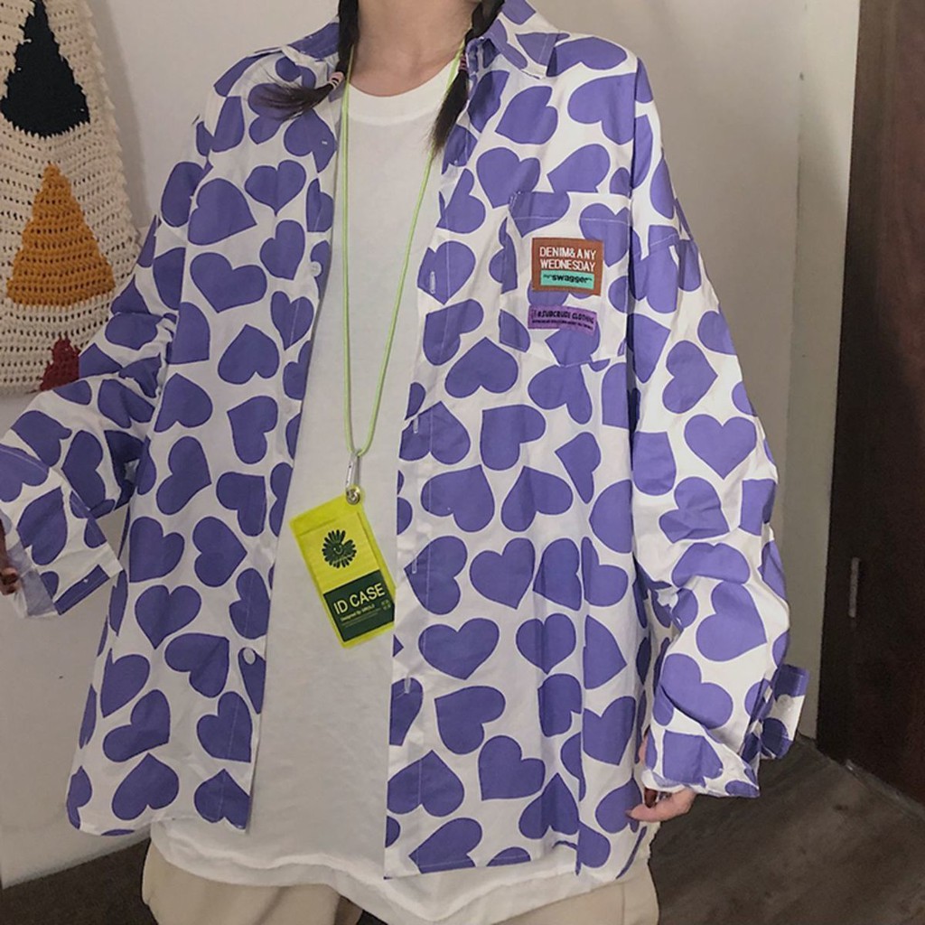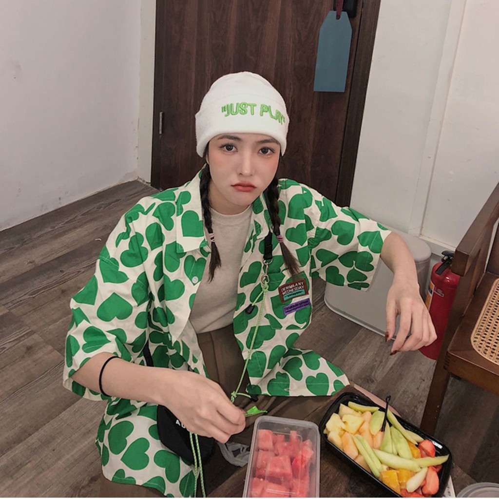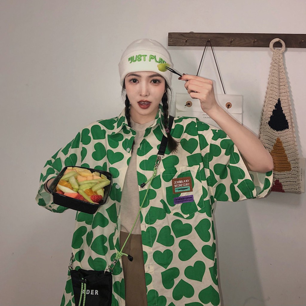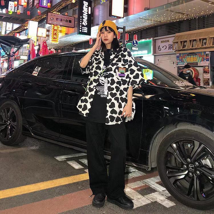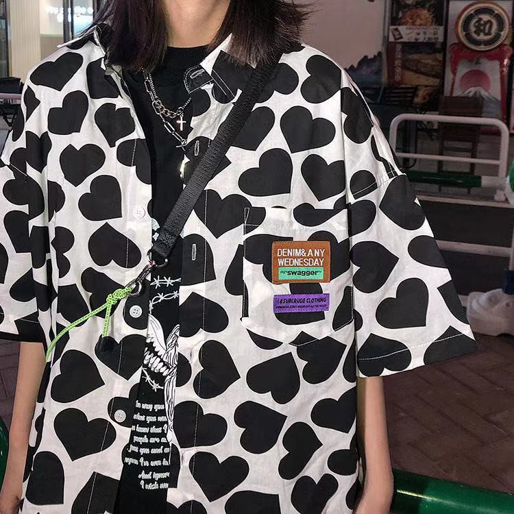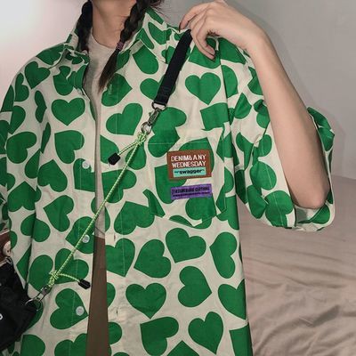 Kemeja motif love lengan pendek wanita mid-length longgar gaya Korea