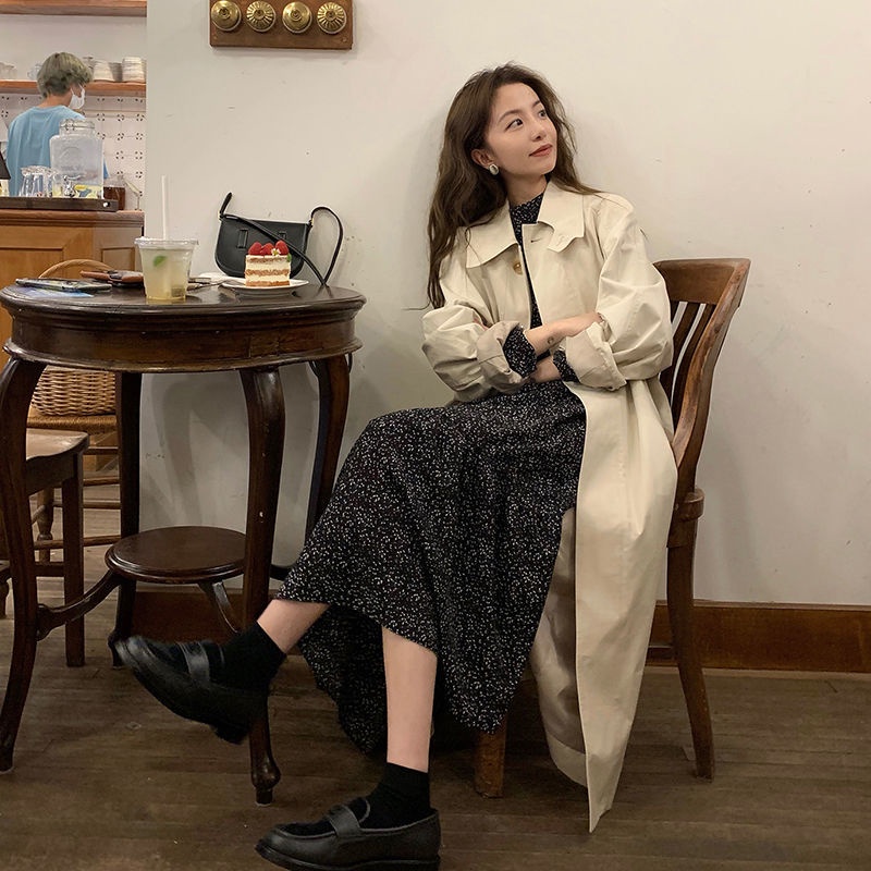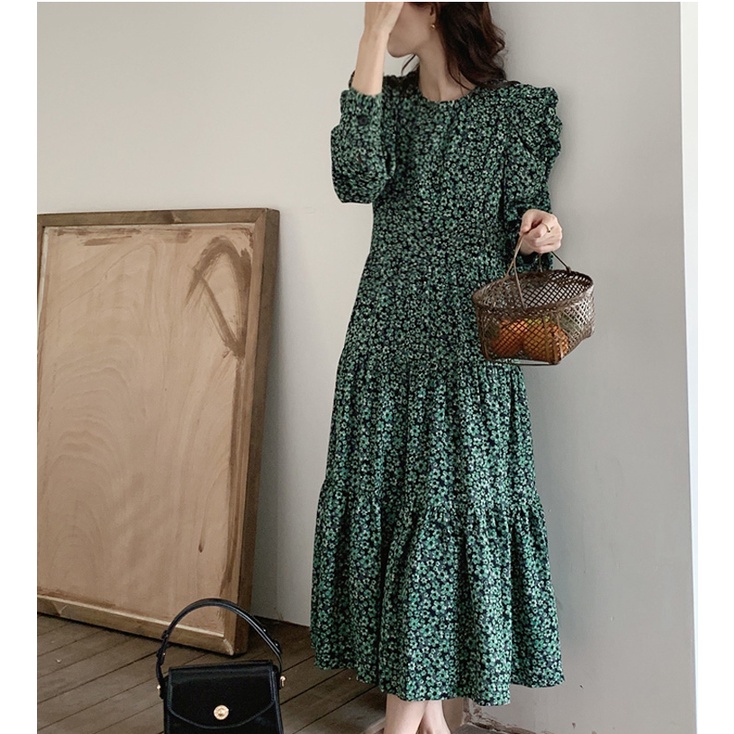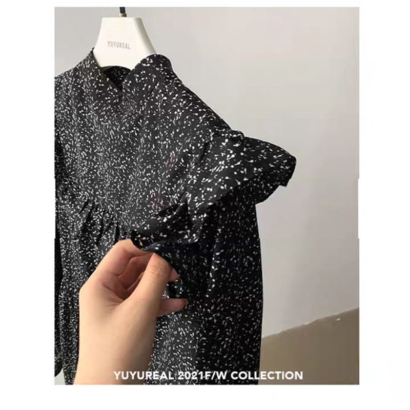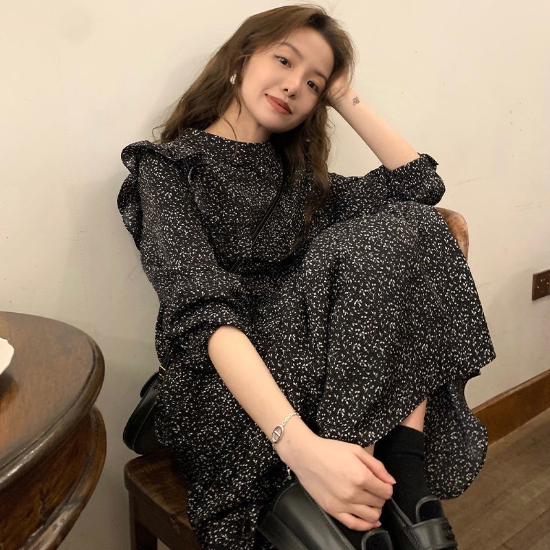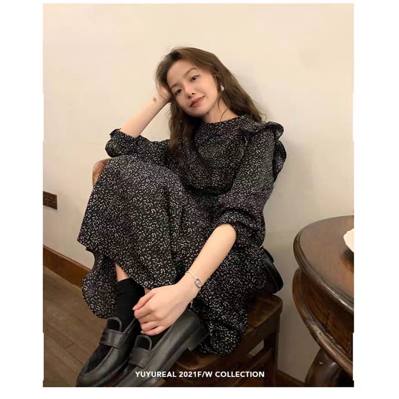AIMEI Jahitan pinggang hitam leher bulat mengacak-acak gaun bunga Prancis wanita