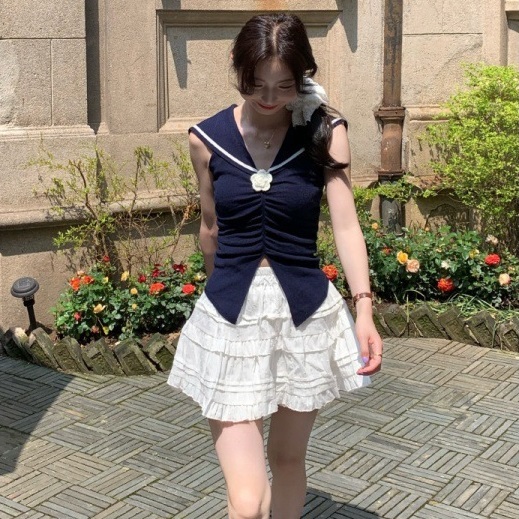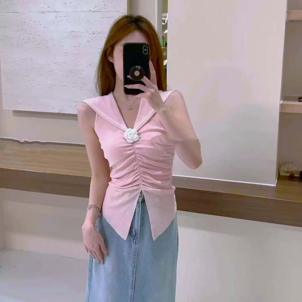 [TTEUDA] Tank Top Wanita Korean Style Sailor Kerut Flower Terbaru | Baju Ketekan Wanita Kerut Belah Tengah Kekinian | Tanktop Wanita Sailor Kerut Flower Knit Premium HBY