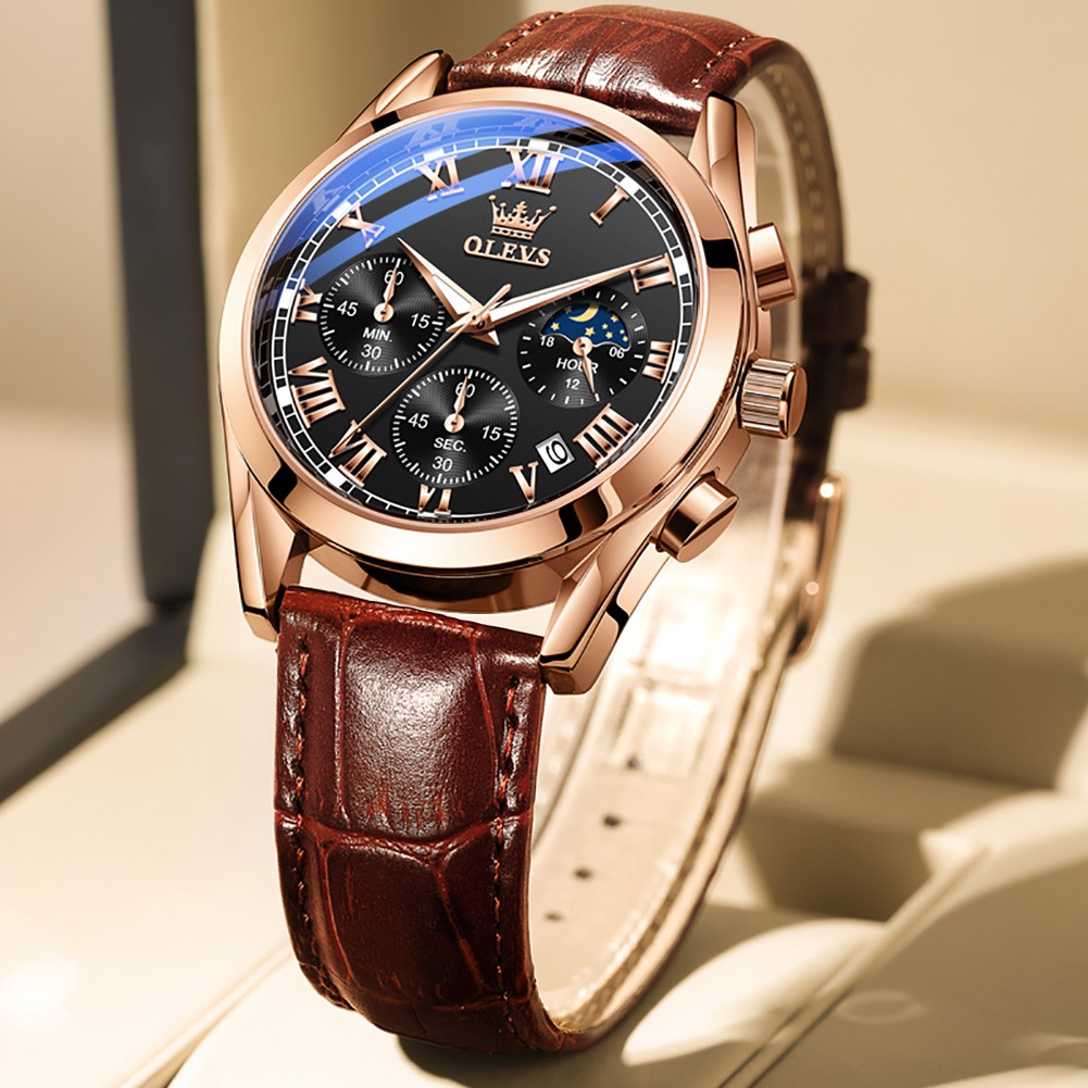 OLEVS Jam Tangan Pria Original Anti Air Kulit Tahan Keren Led Hitam Coklat Luxury Chronograph Watch Men Multifungsi
