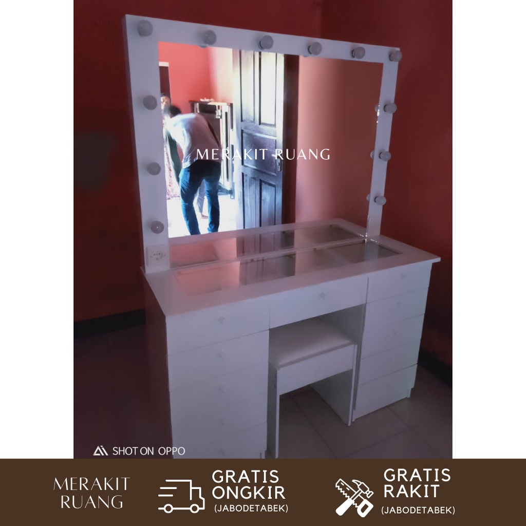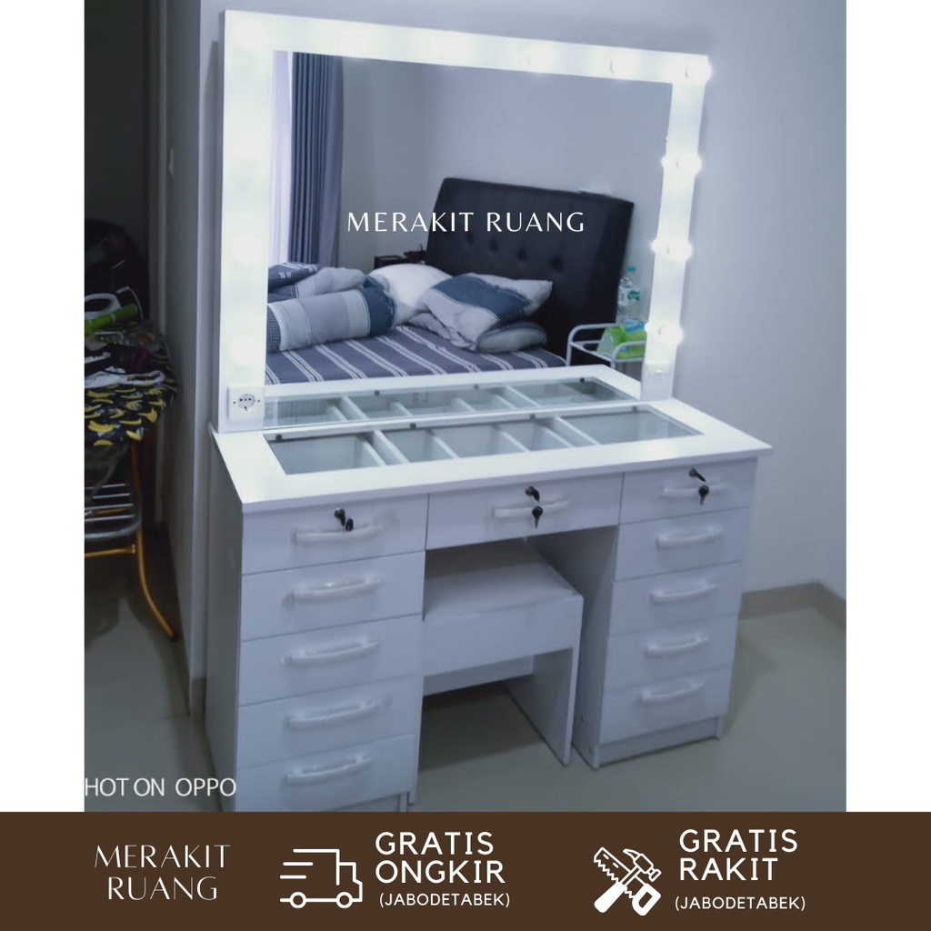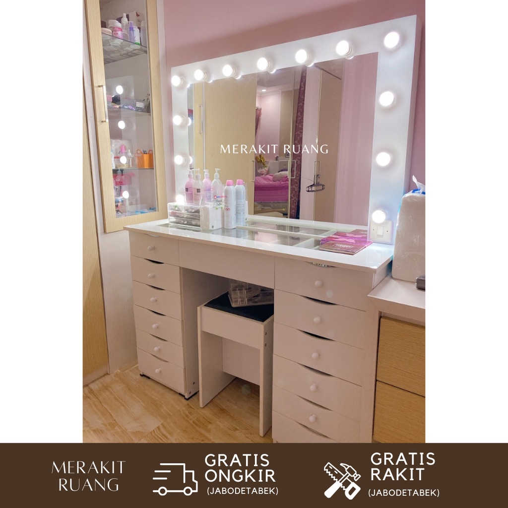 Meja rias vanity mirror terang besar 10 + 1 laci dengan lampu rak make up model minimalis elegan