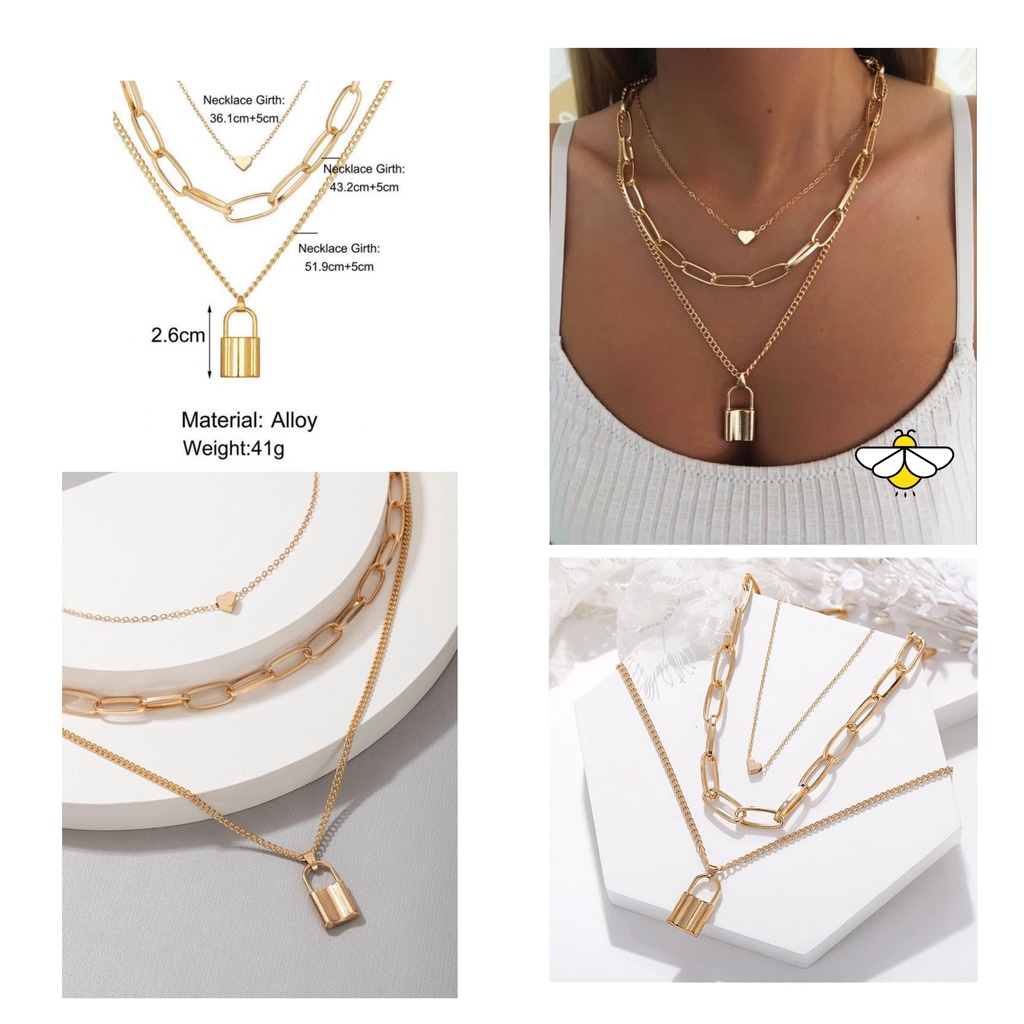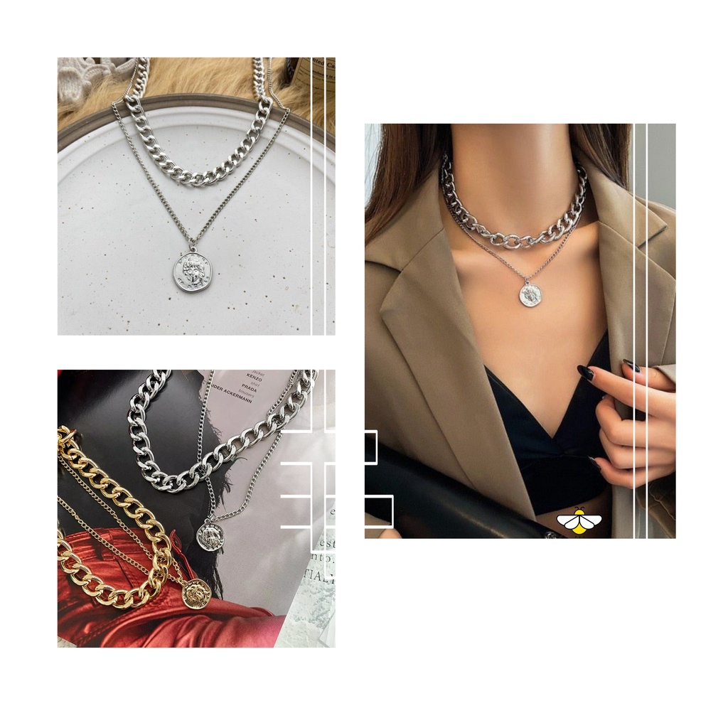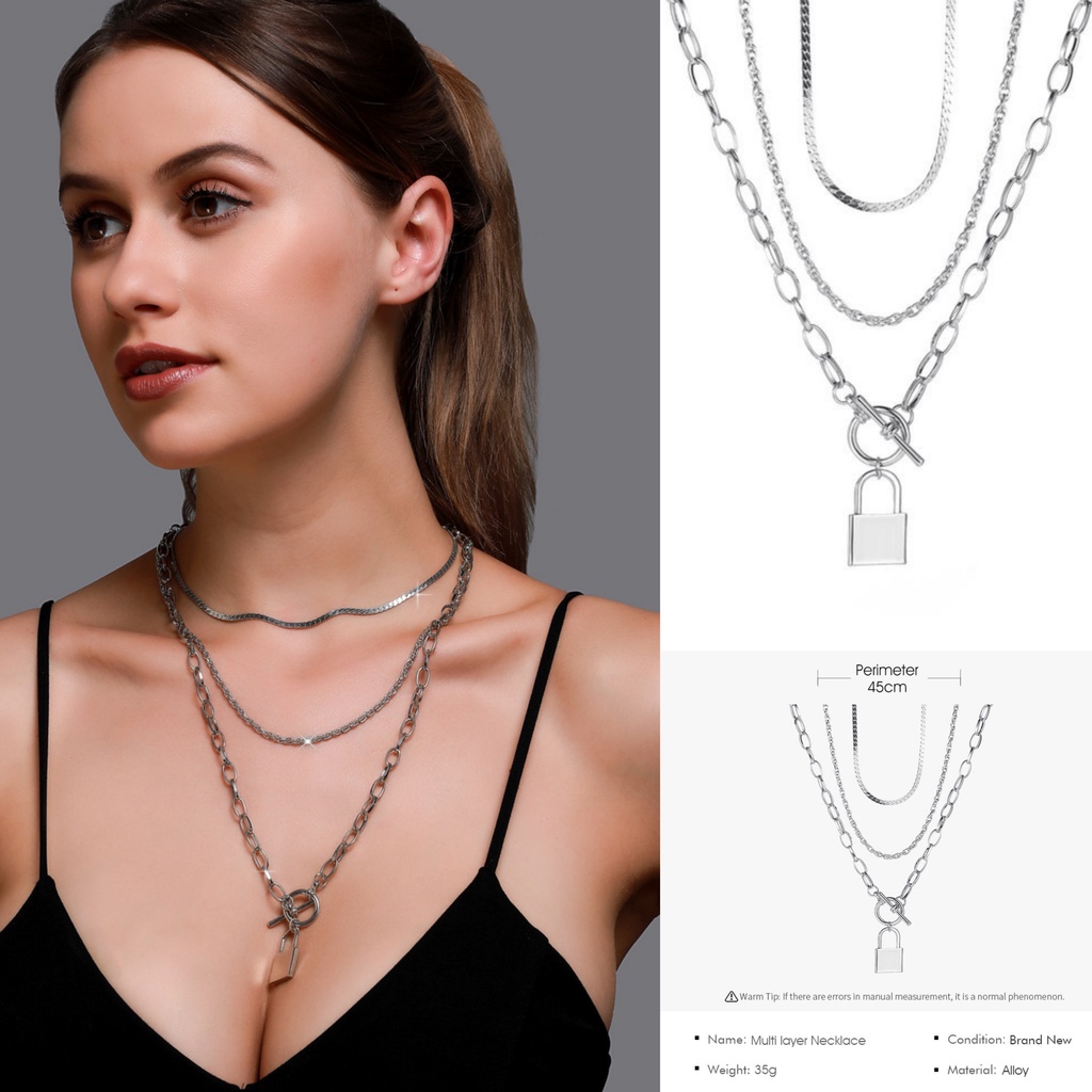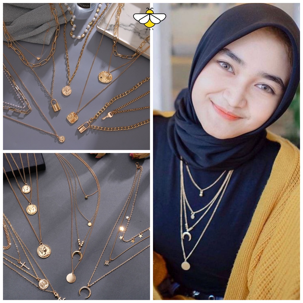 Kalung Wanita Hijab Multilayer Bertingkat Warna Gold Silver Gaya Korea Retro Aksesoris Kalung Rantai Moon Mutiara Gembok Potret Gaya vintage/Kalung wanita Ootd