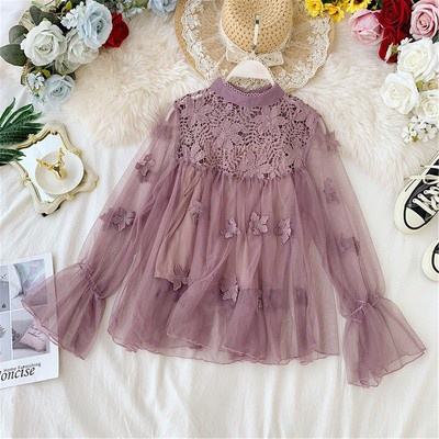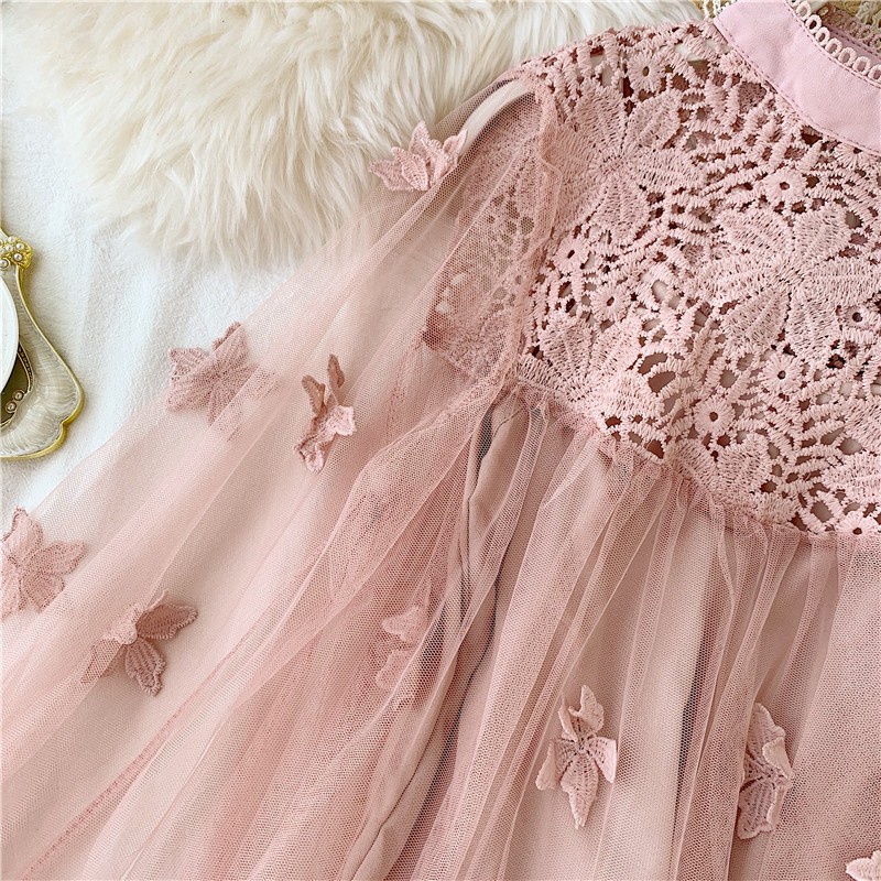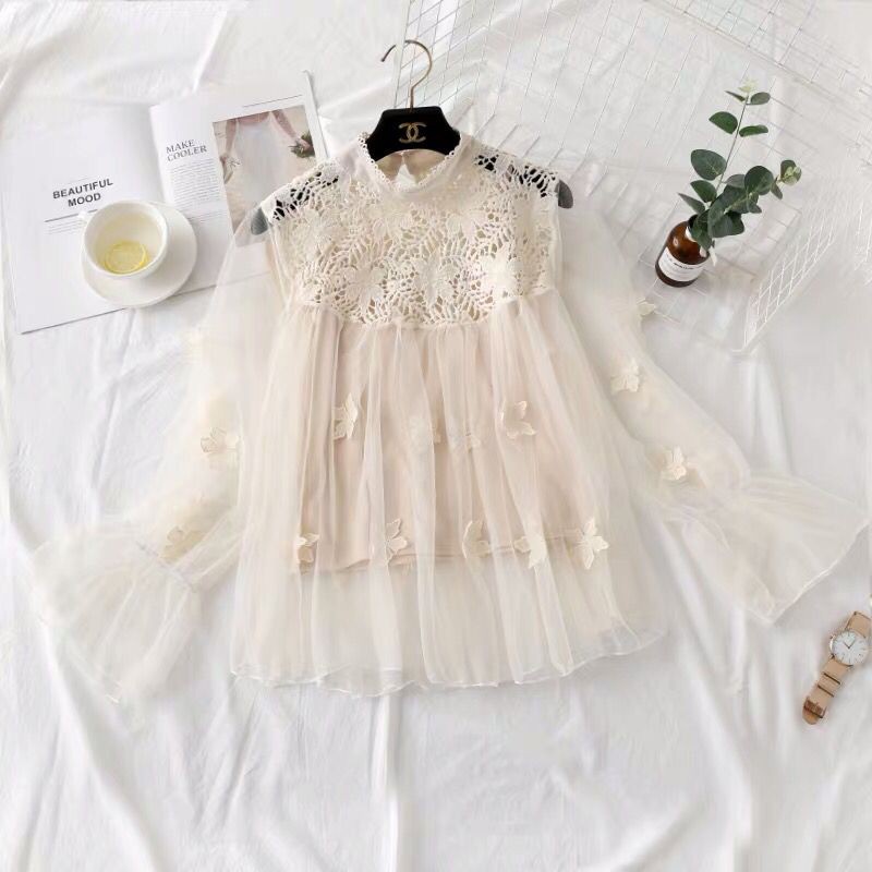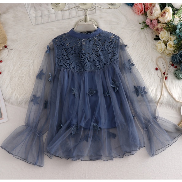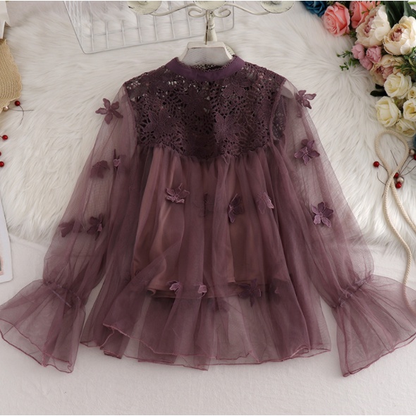【READY】2 potong kemeja + rompi Korea longgar 3D tiga dimensi bunga renda atasan lengan panjang