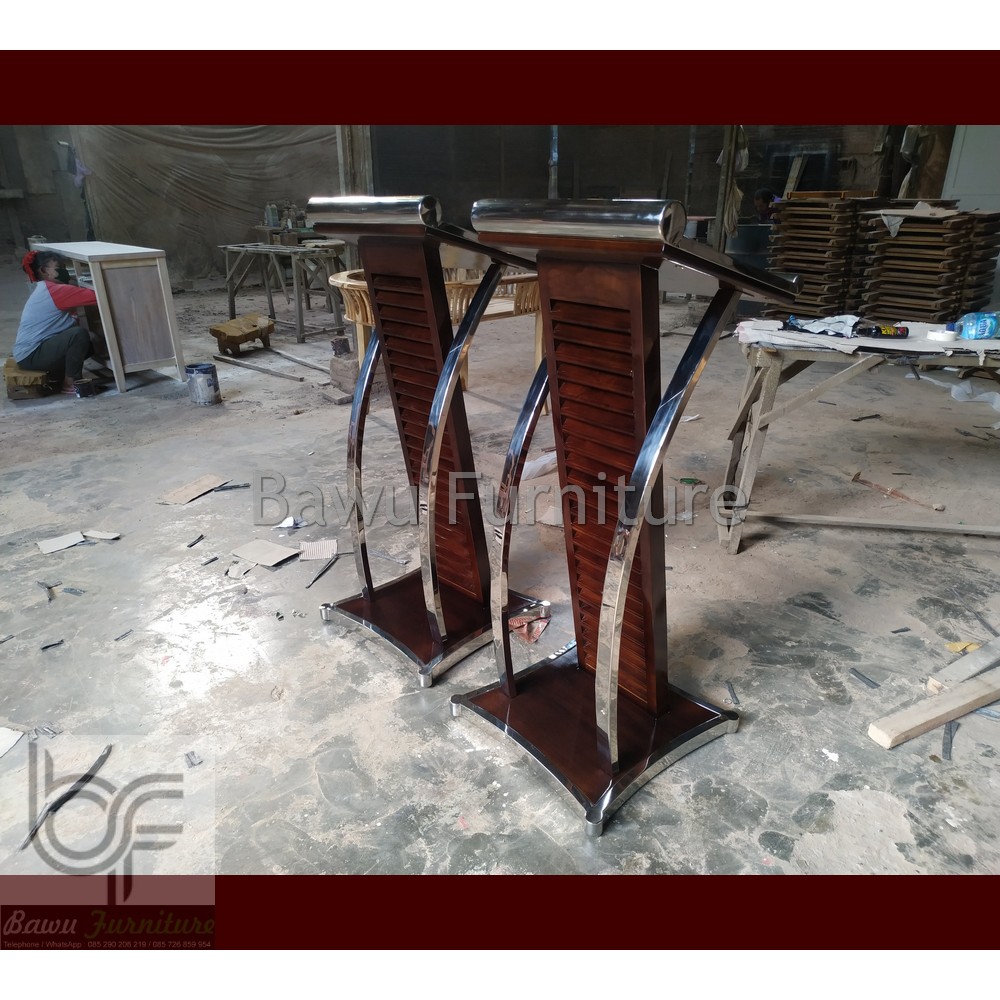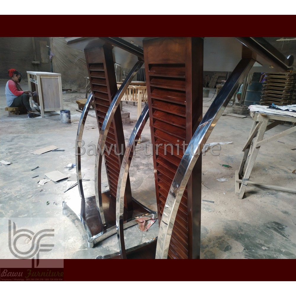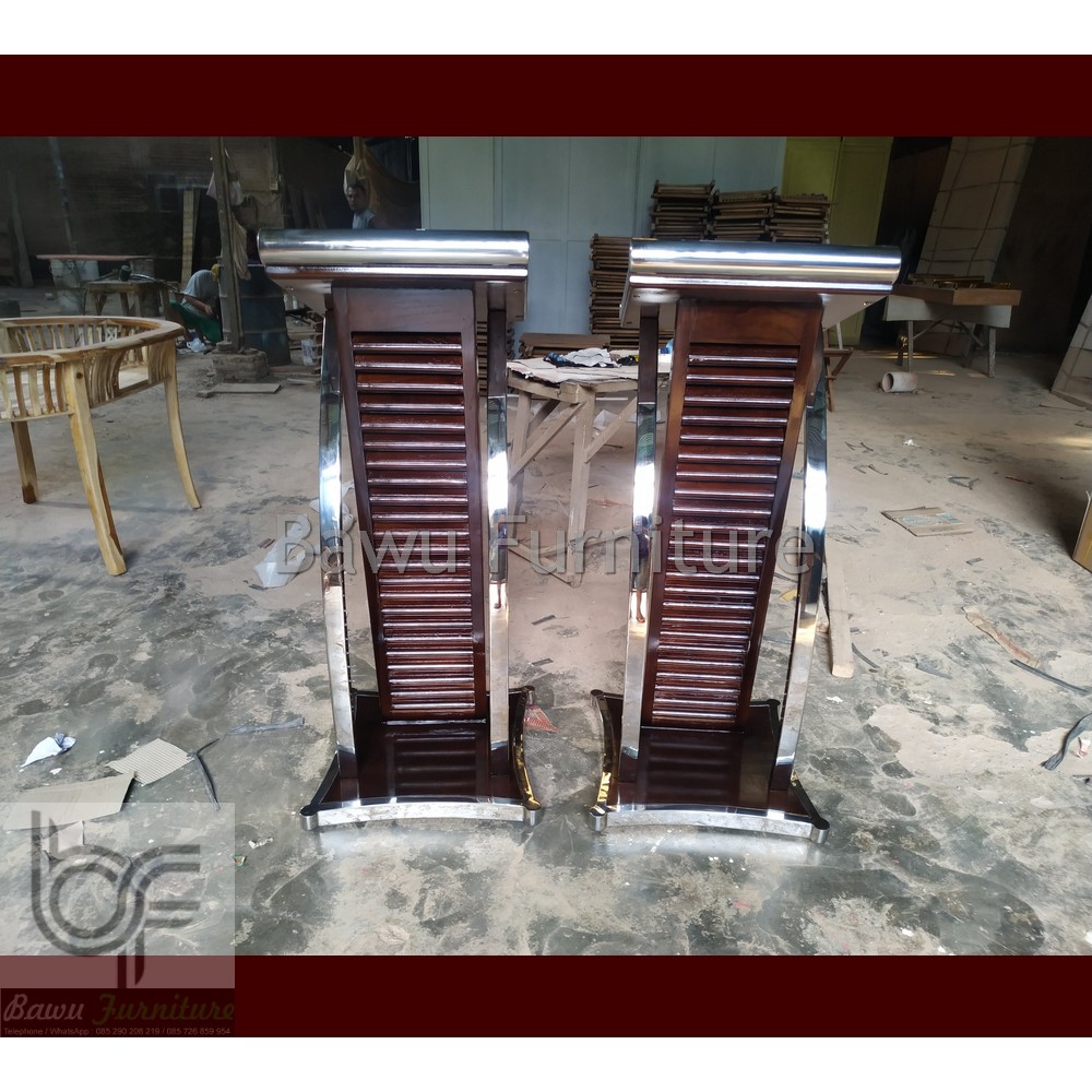 Podium Pidato Mimbar Minimalis Stainless Steel Kombinasi Kayu Jati Solid