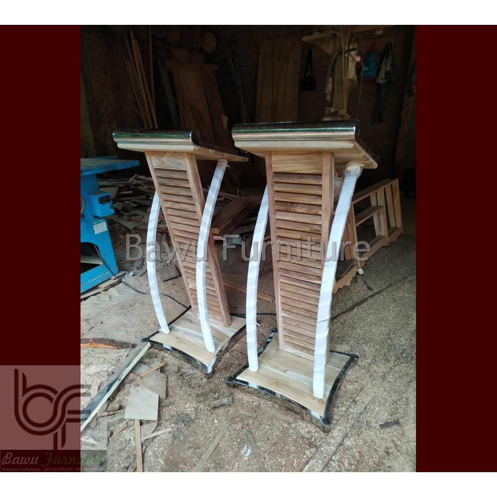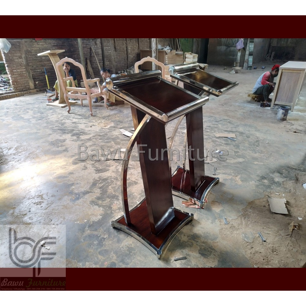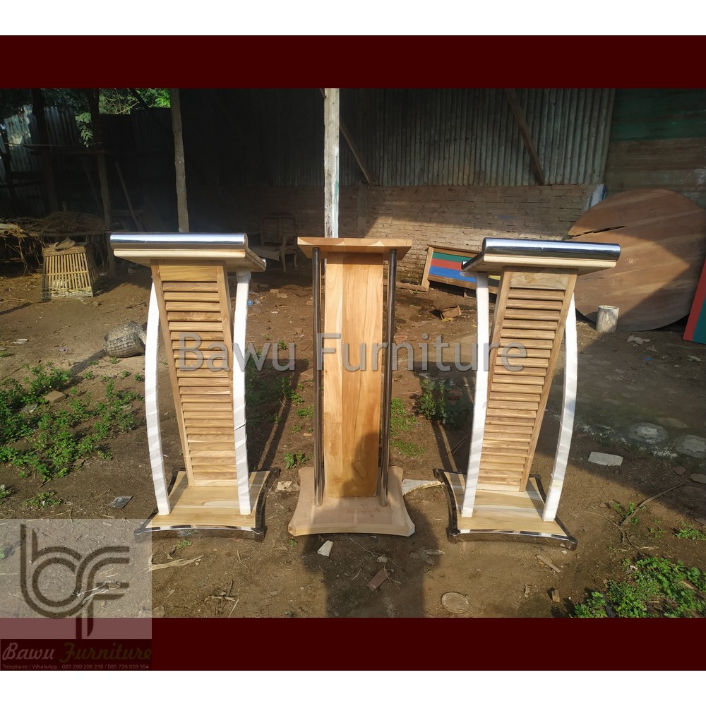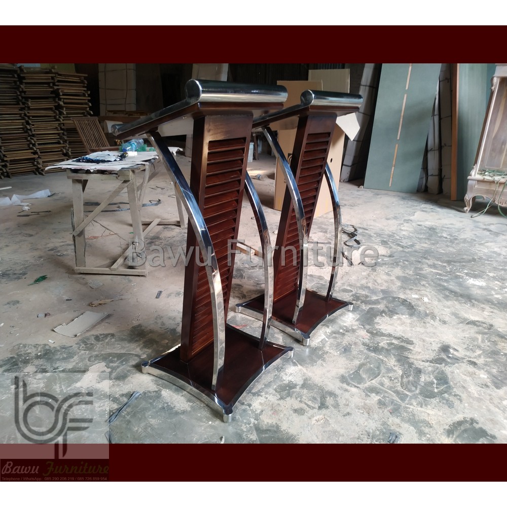 Podium Pidato Mimbar Minimalis Stainless Steel Kombinasi Kayu Jati Solid