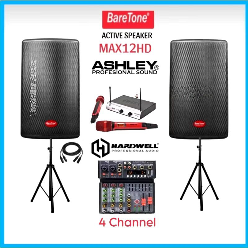 Paket komplit Sound System Speaker Aktif BareTone Max12Hd Mixer Hardwell Mic Wireless 2 Ashley Original Garansi Resmi Fullset