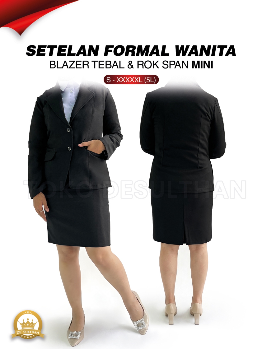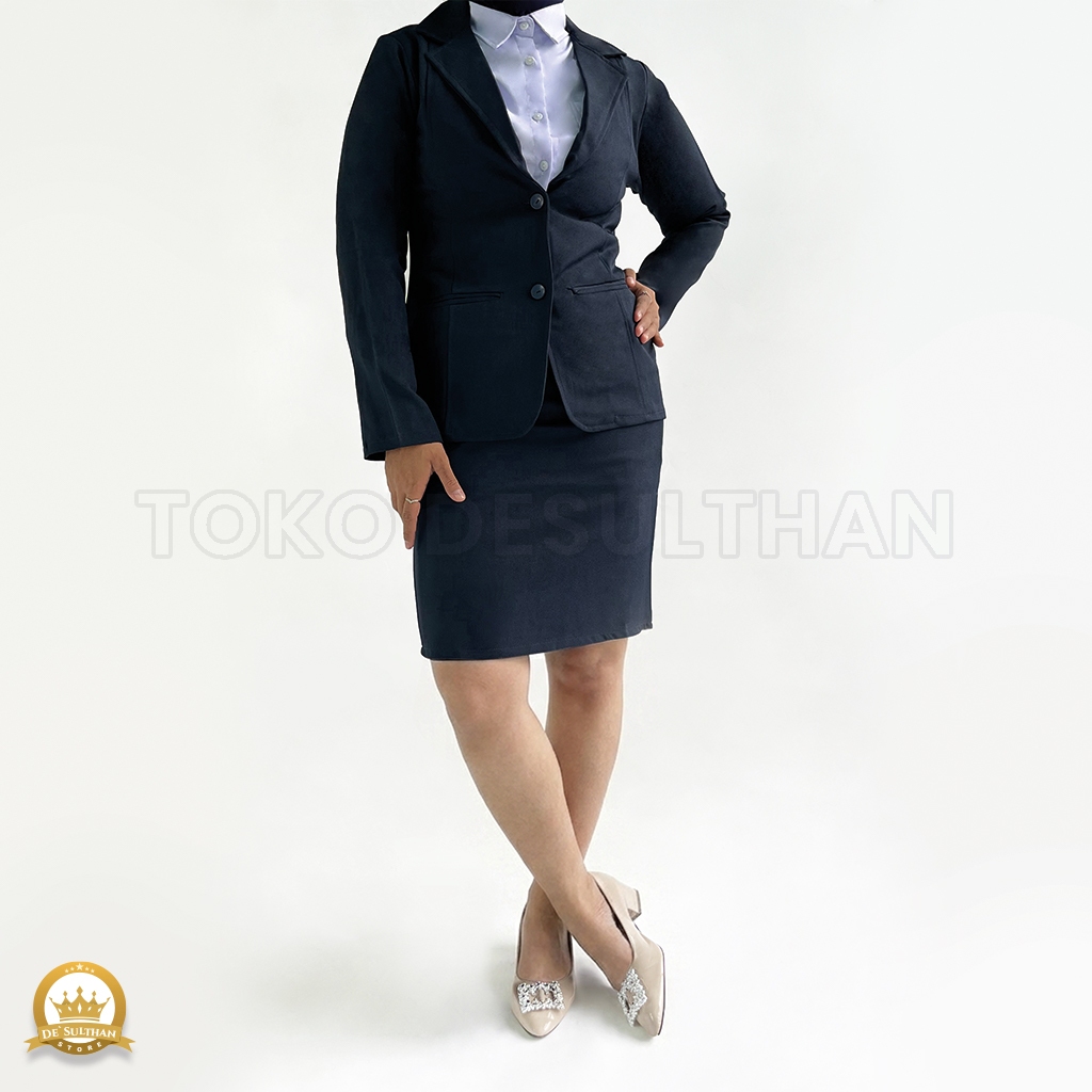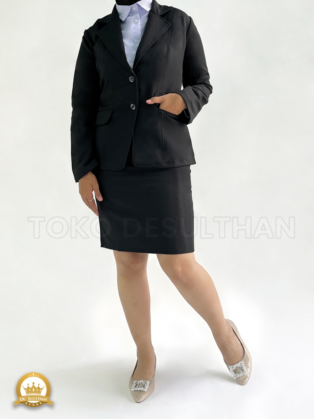 Stelan Blazer Wanita Dengan Rok Span Mini Pendek | Outfit Kantor Formal Elegan | Setelan Jas Kerja Cewek Polos Dewasa Remaja | Warna Hitam Abu | Big Size Jumbo 7/8 Korea | Pakaian Kantoran Stylish Terbaru