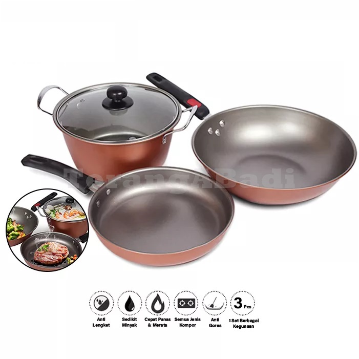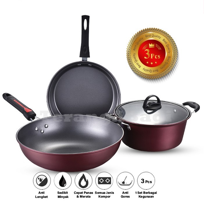 Panci Set QME 2432 Panci Set Wajan 1 Set Anti Lengket Isi 3 Pcs Tutup Kaca ( COD )
