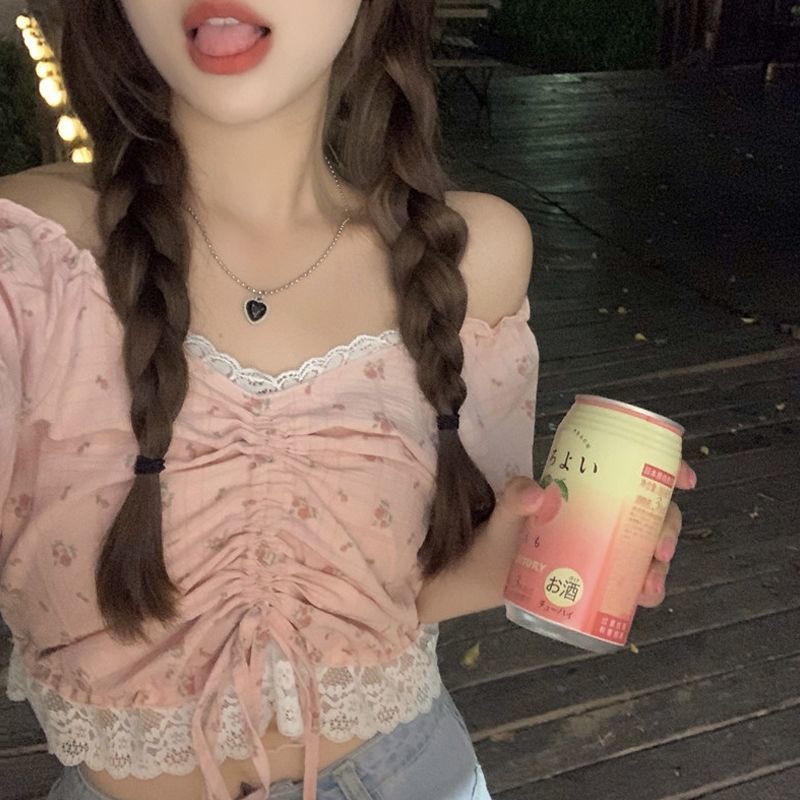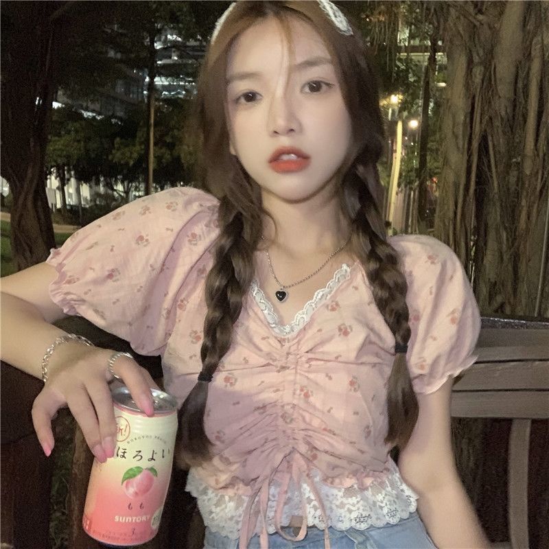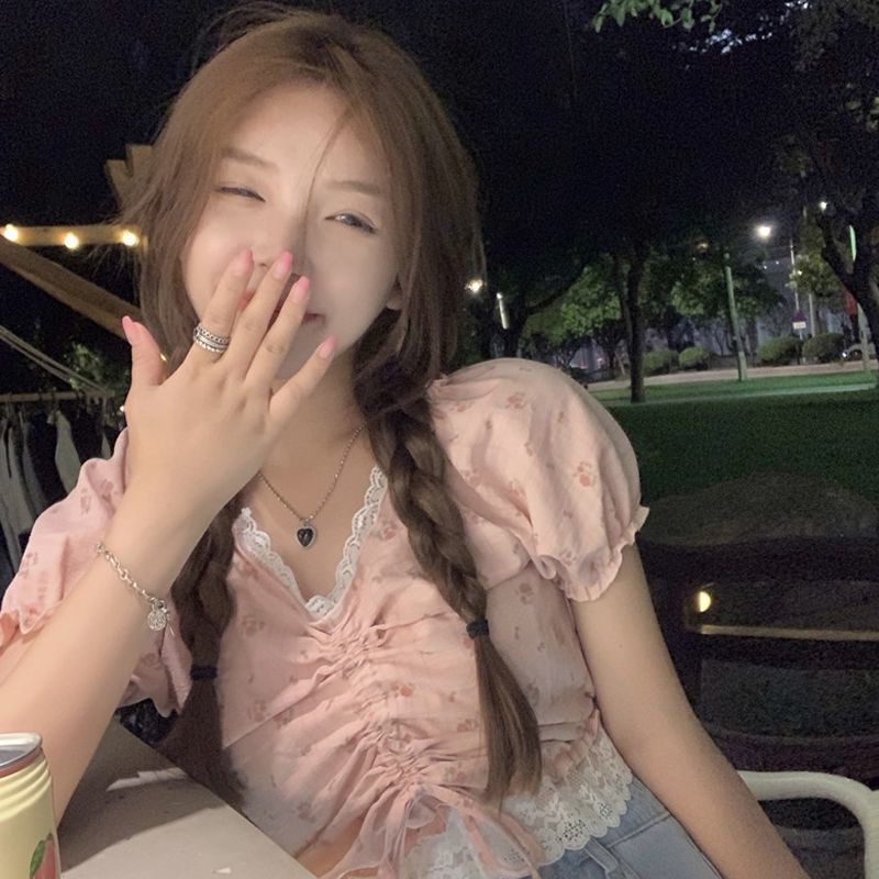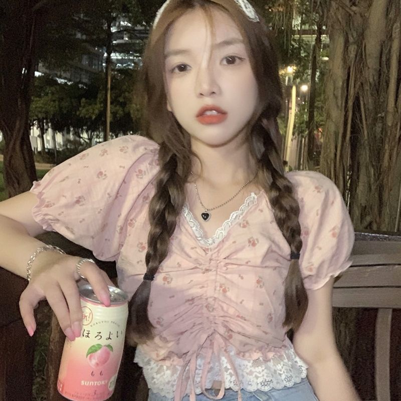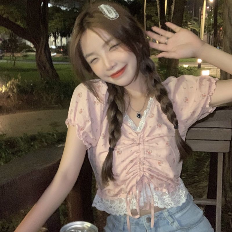 enamorShifon blus lace trim V-neck floral kemeja lengan pendek wanita perasaan manis cropped top