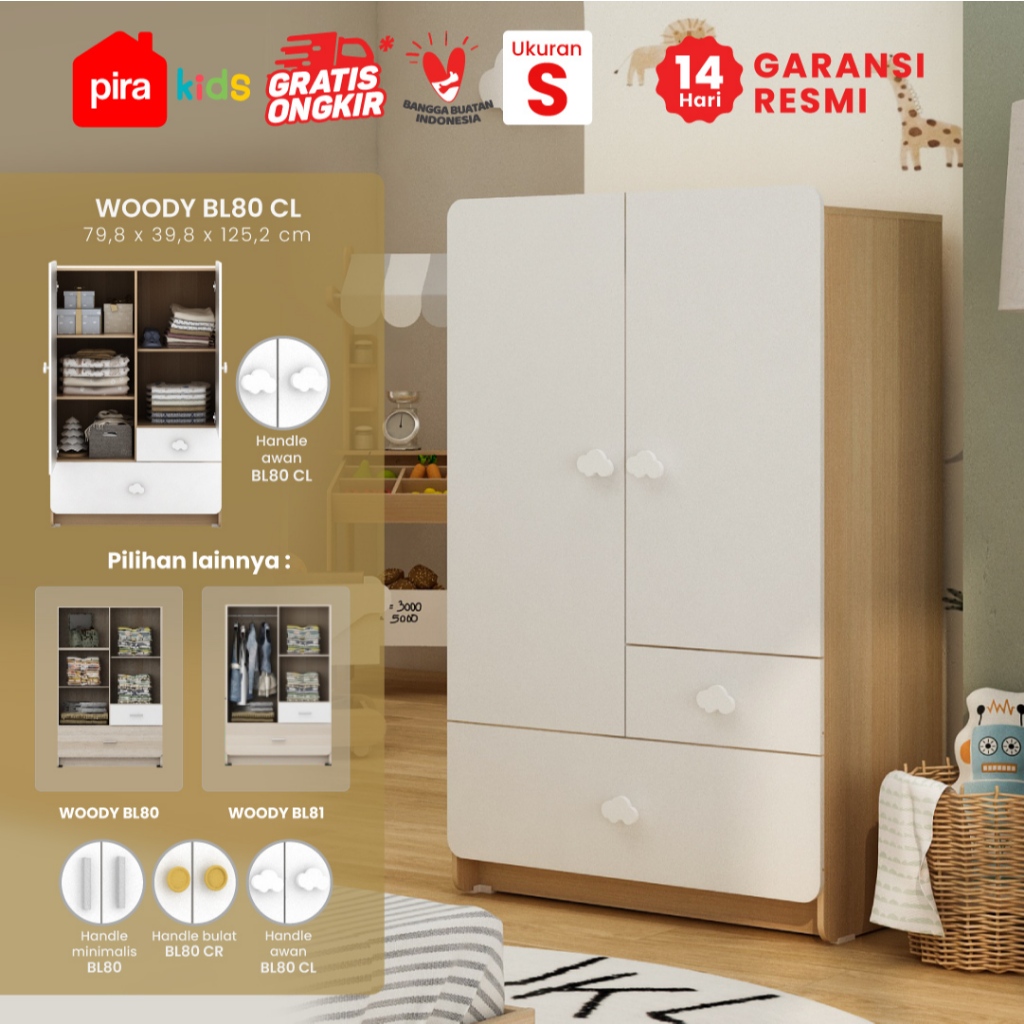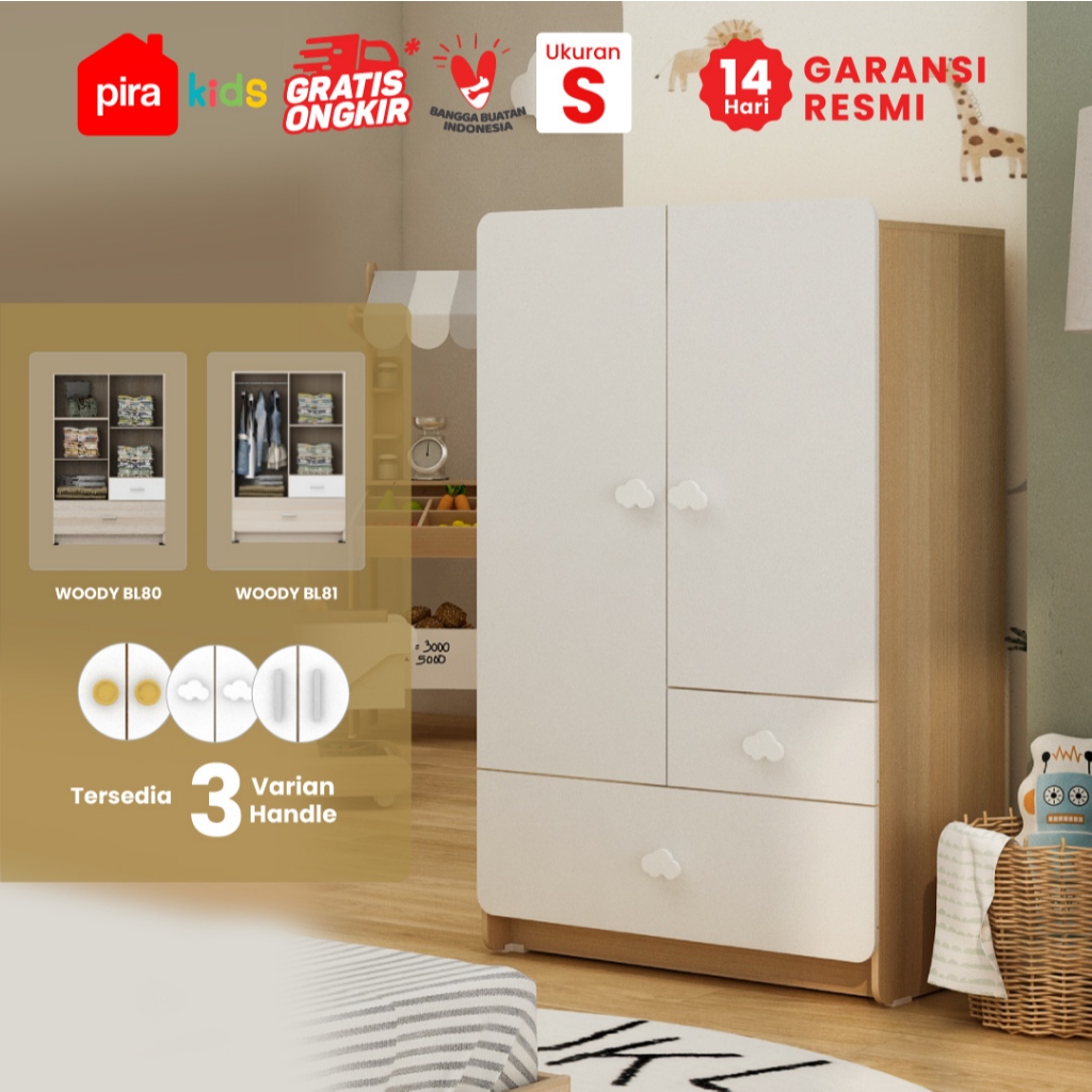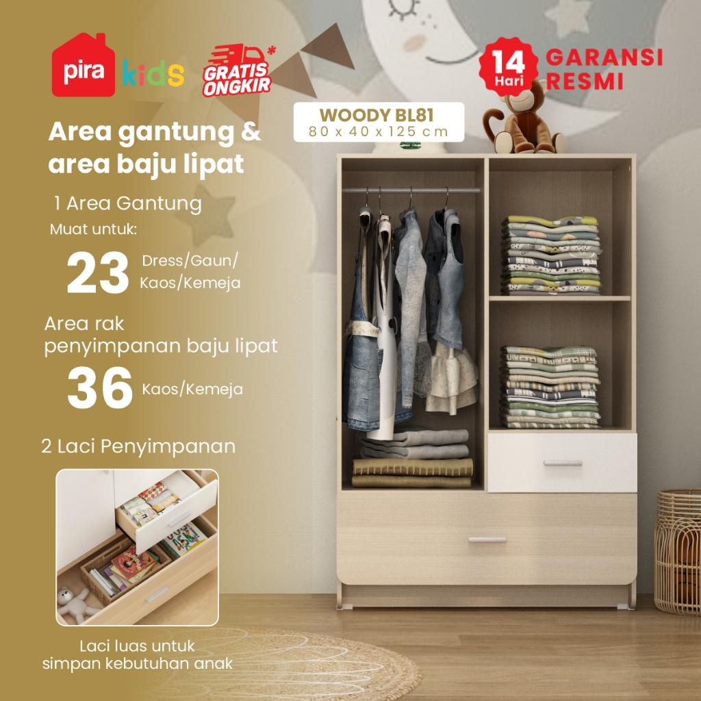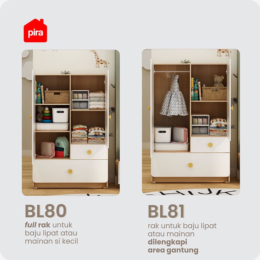 Pira Kids - Woody BL80 Lemari Pakaian Anak 2 Pintu Full Rak