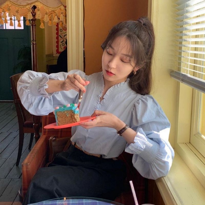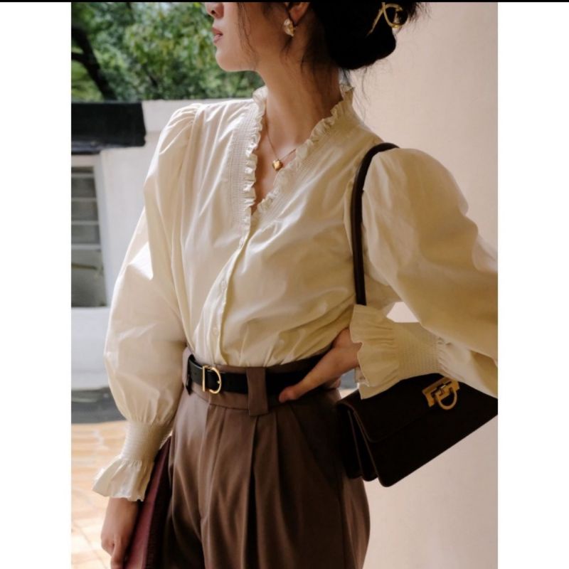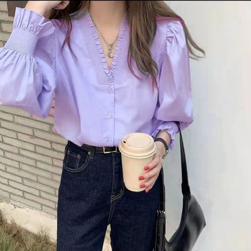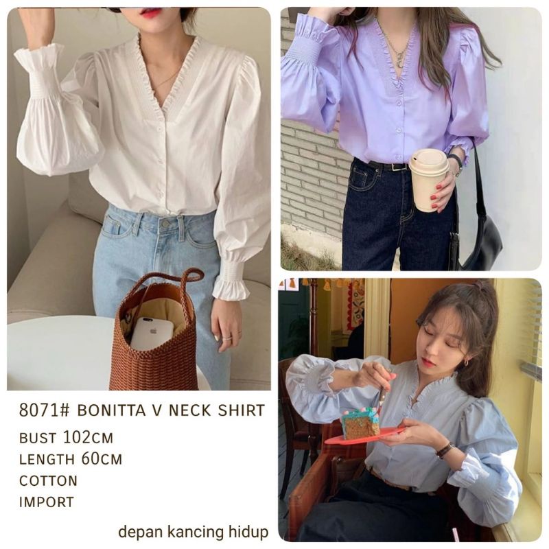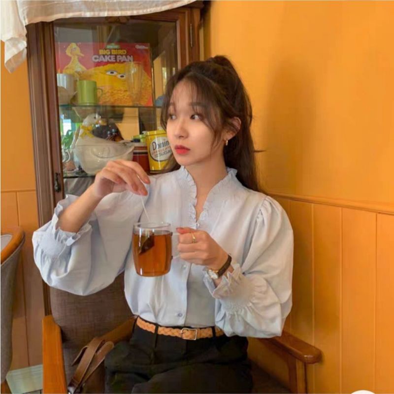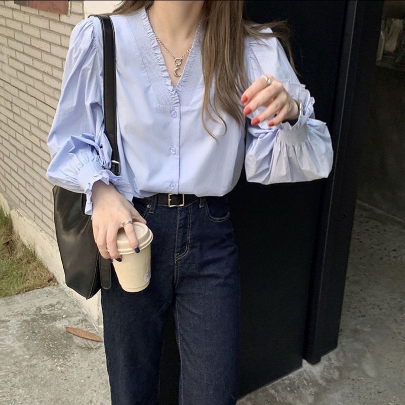 8071 REALPICT Baju atasan kemeja kerja lengan panjang biru putih polos korean style wanita import baju atasan blouse kemeja kerja kantor pesta kondangan cewek remaja korea import murah terbaru kekinian