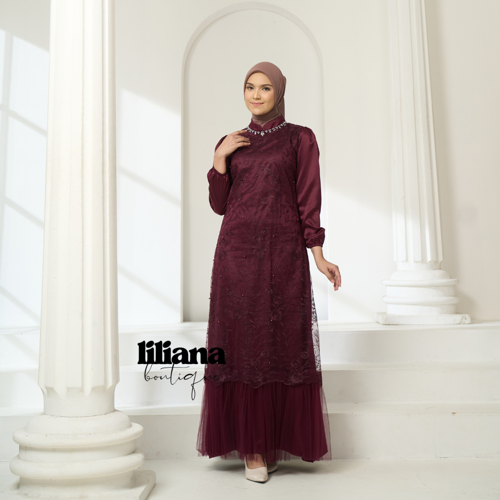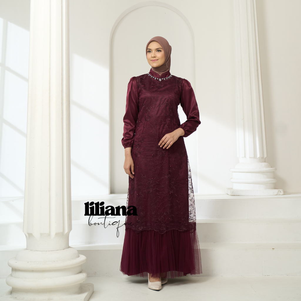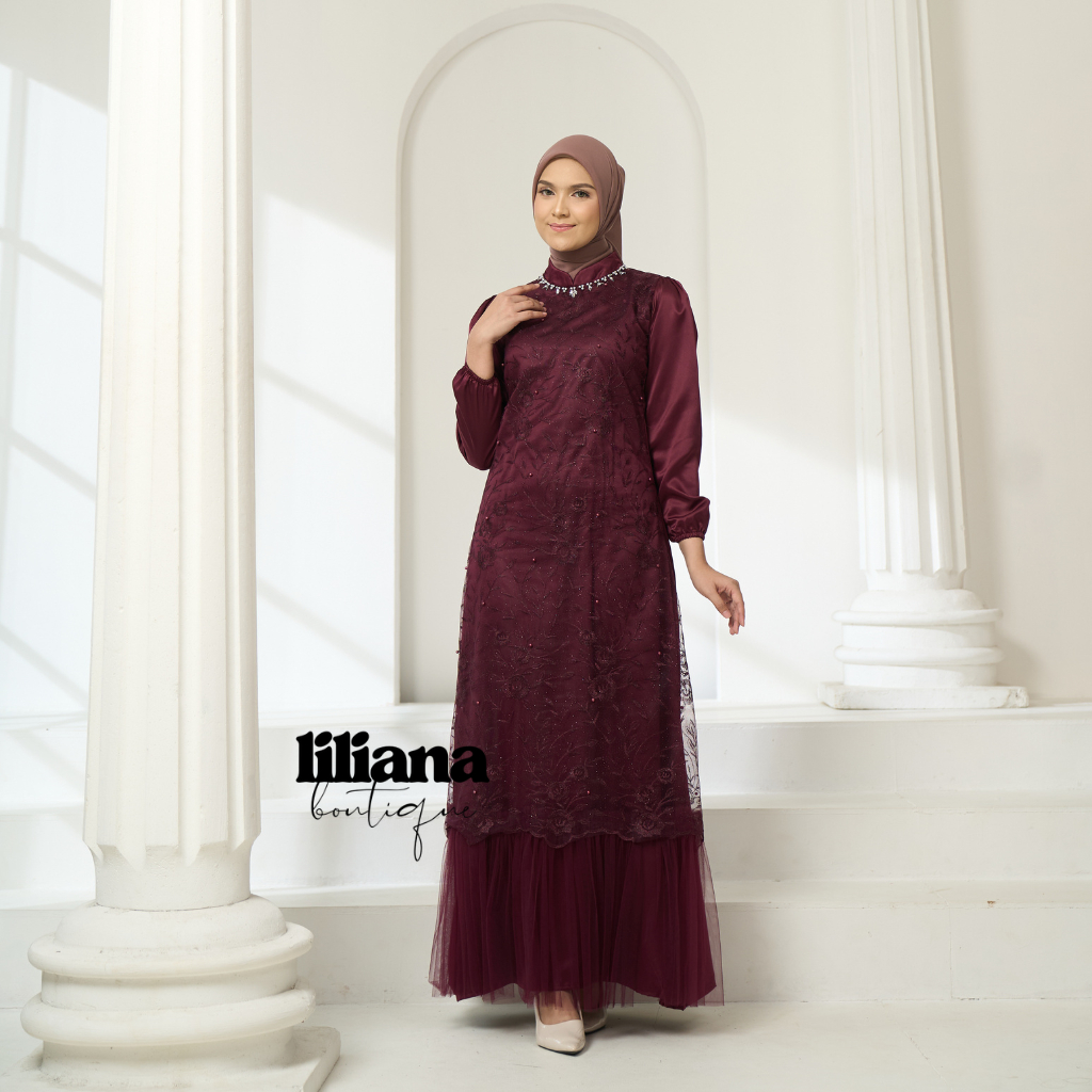 Aleeya Dress Gamis Lebaran 2026 Putih Burgundy Mahogany Brokat Seragam Keluarga Elegant