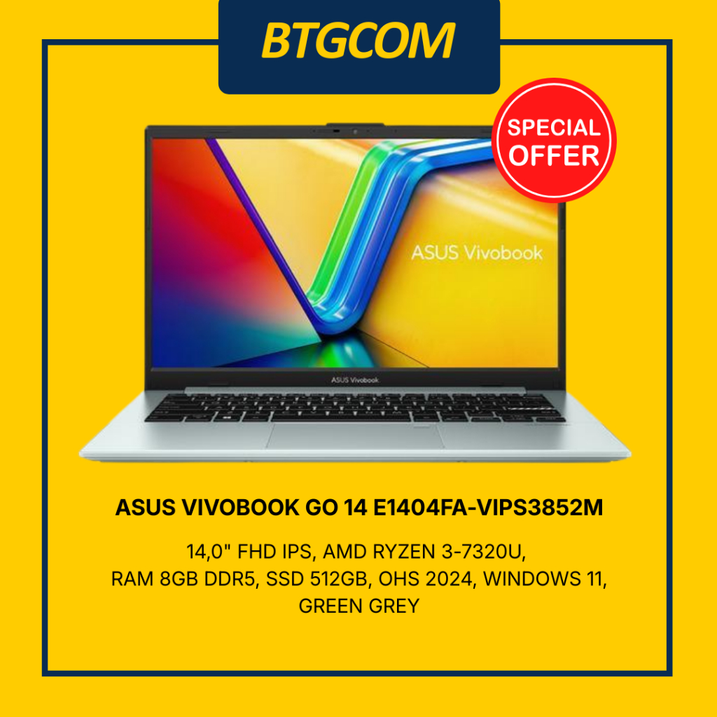 LAPTOP ASUS VIVOBOOK GO 14 E1404FA-VIPS3852M 14 INCH FHD IPS, AMD RYZEN 3-7320U, RAM 8GB DDR5, SSD 512GB, OHS 2024, WINDOWS 11, GREEN GREY