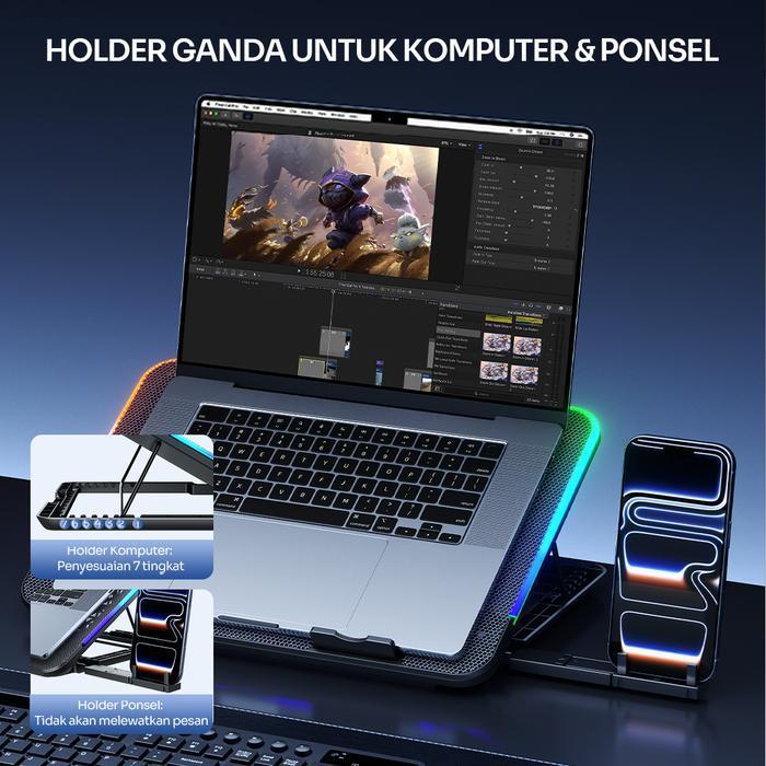 COOLINGPAD ROBOT RCP20 BLACK DUAL PORT USB TYPE-A KIPAS PENDINGIN 6 INTI DENGAN HOLDER SLOT HANDPHONE EFEK LAMPU RGB
