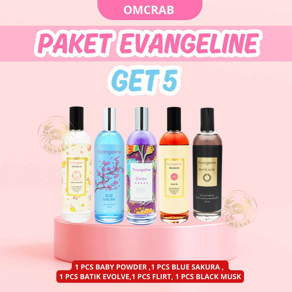 [Get 5] Paket hemat parfum evangeline (baby powder 1 pcs + blue sakura 1 pcs + batik evolve 1 pcs +flirt 1 pcs + black musk 1 pcs) paket parfum wanita best seller hemat wangi untuk kado reseller
