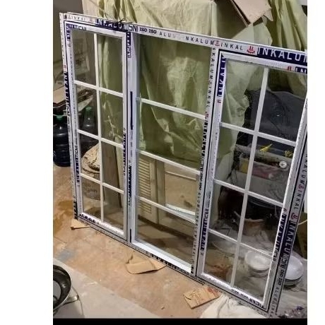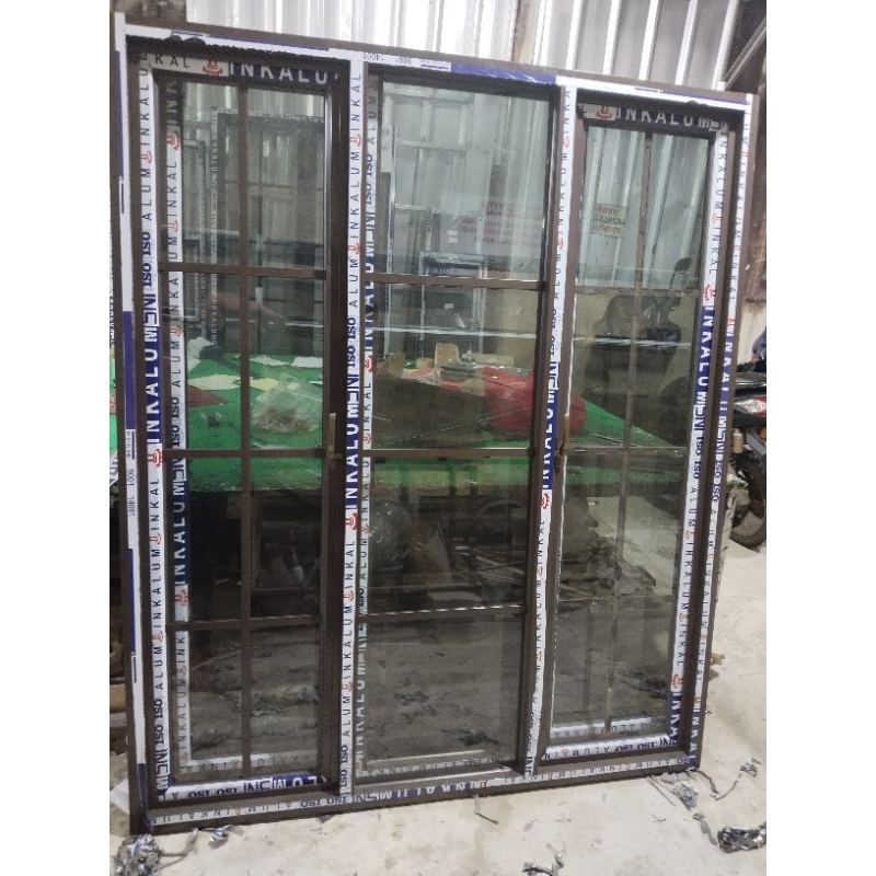 Jendela aluminium ornamen L150xT180 3kolom 2 hidup (1 tengah mati ornamen tengah garis horizontal)3inci sama seperti difoto