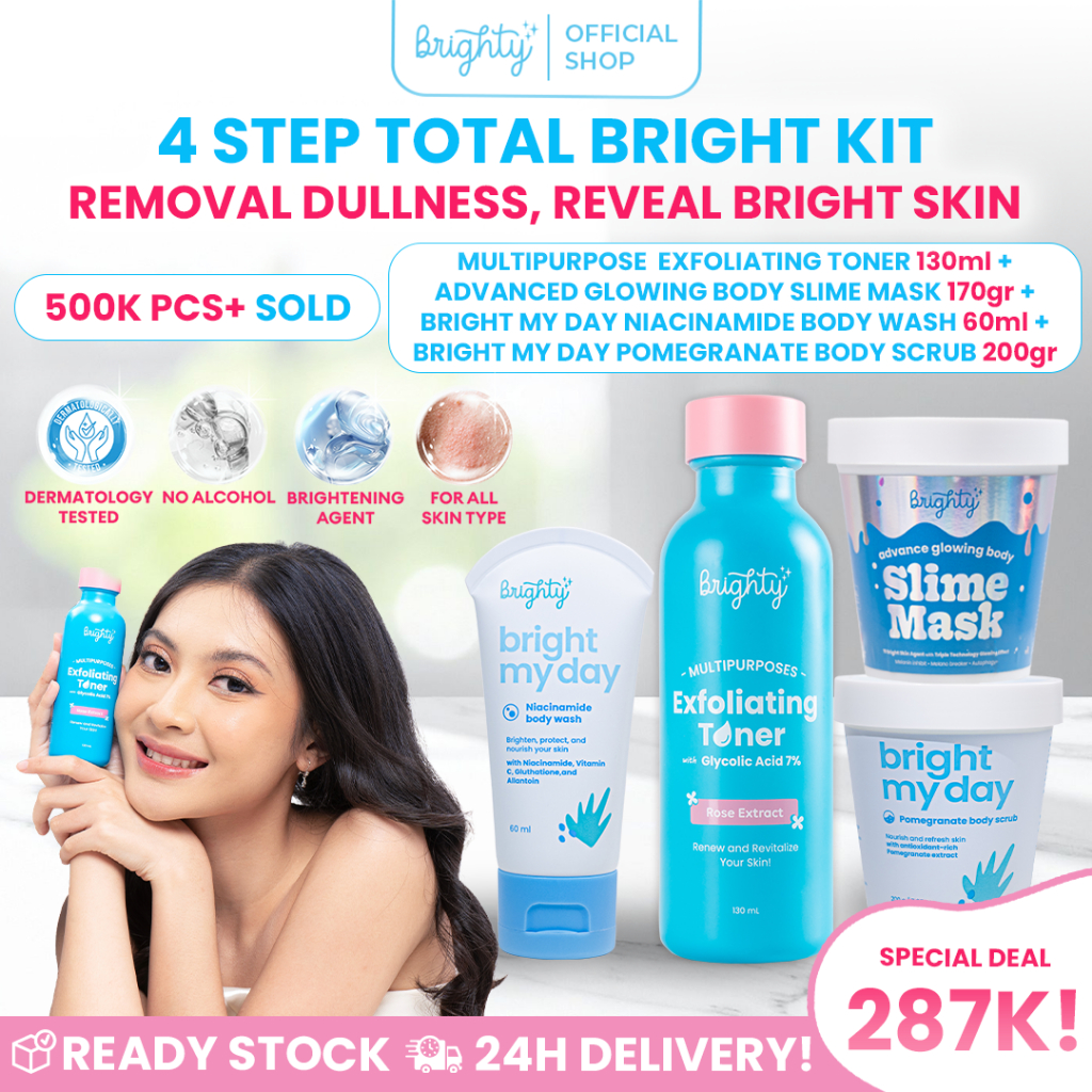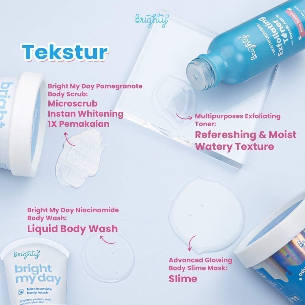 Brighty Multipurpose Exfoliating Toner X Brighty Advanced Glowing Body Slime Mask X Brighty Bright My Day BMD Niacinamide Body Wash 60 ML X Brighty Bright My Day BMD Pomegranate Body Scrub Pemutih badan pencerah badan pencerah ketiak pemutih leher pencer