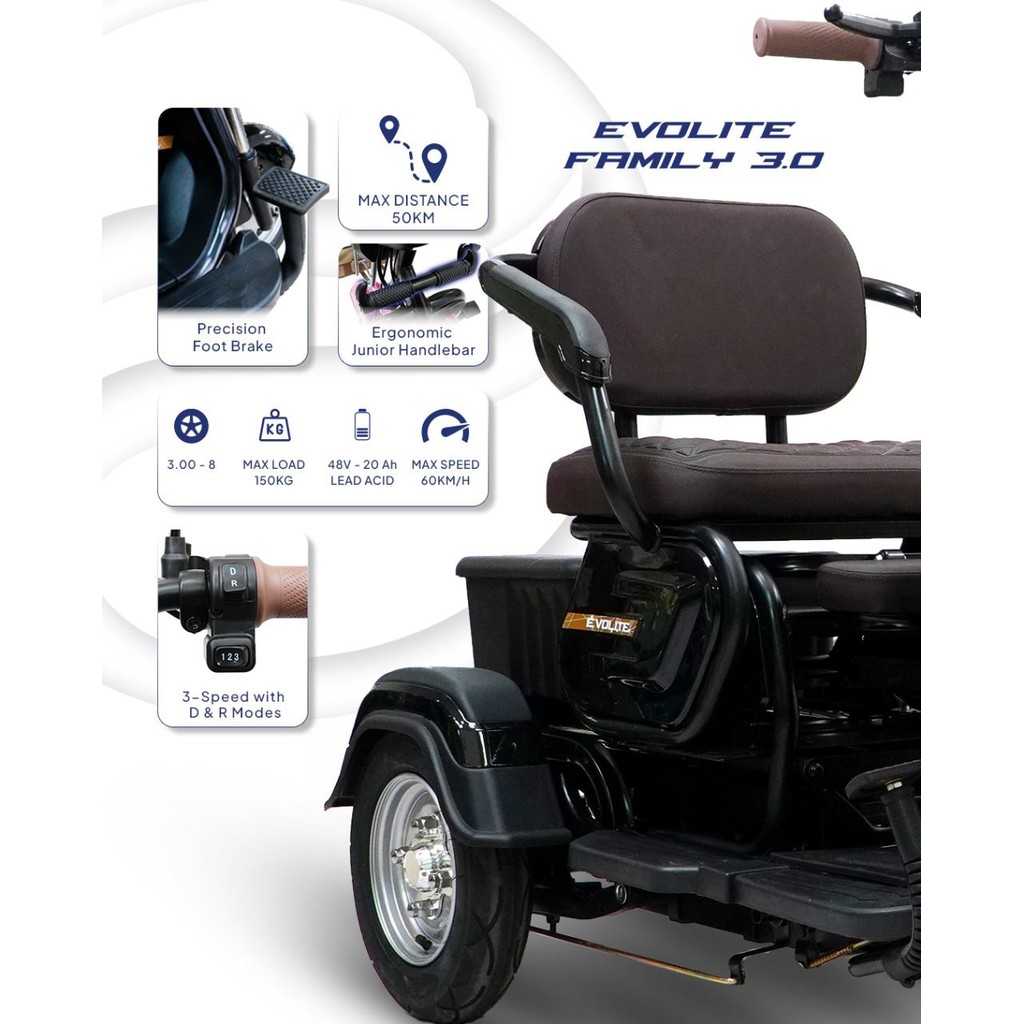 Sepeda Listrik Roda 3 Evolite Family 3.0 dengan Mesin Mid Drive Motor 800W dan Battery Kering 48V 20Ah
