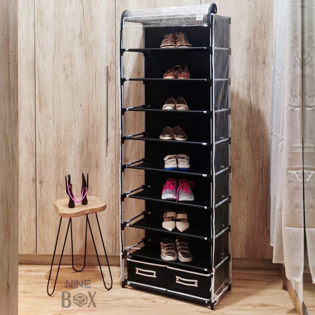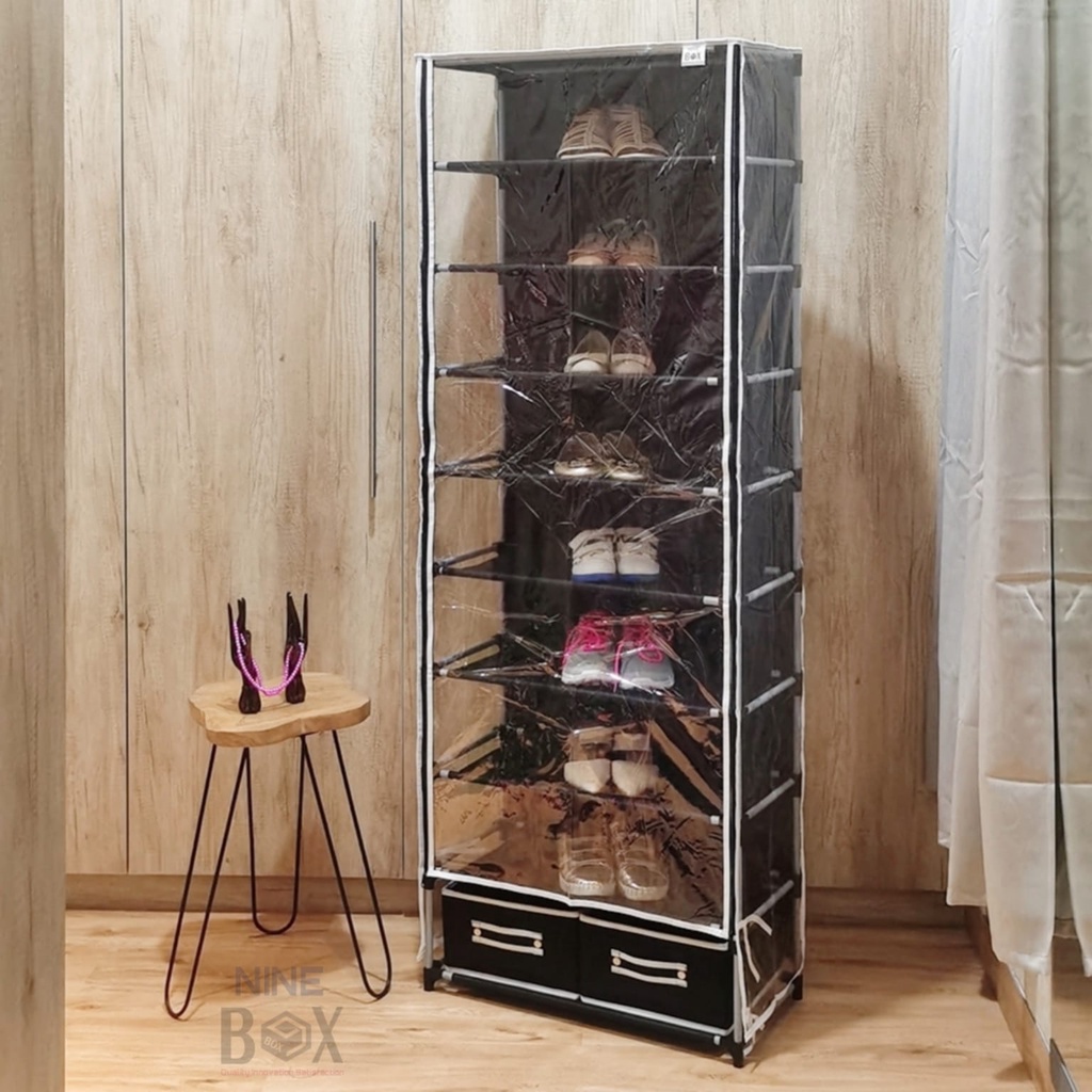 Nine box rak lemari sepatu 9 ruang dengan sarung cover penutup anti debu dilengkapi dengan 2 laci