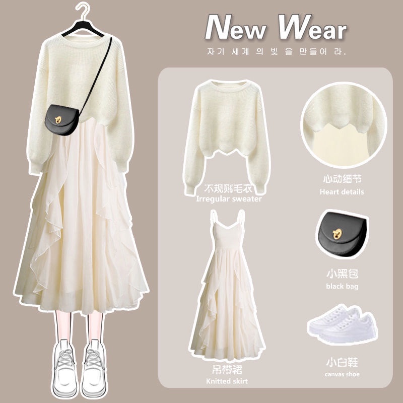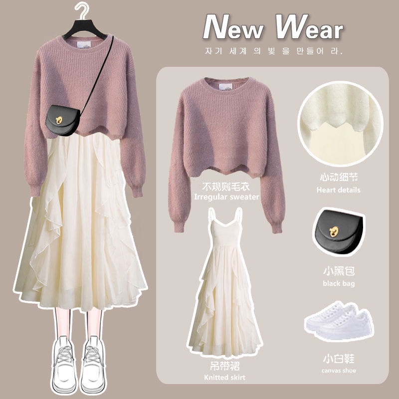 Large women's winter suit women's 2021 new loose thin sweater suspender dress two-piece set
